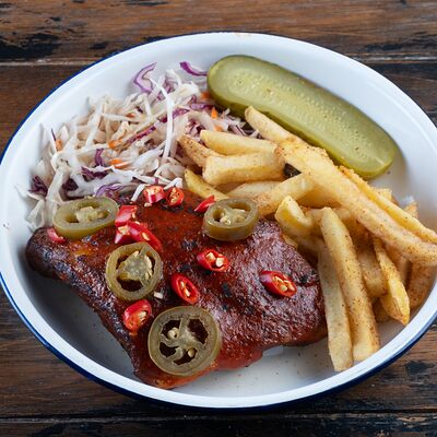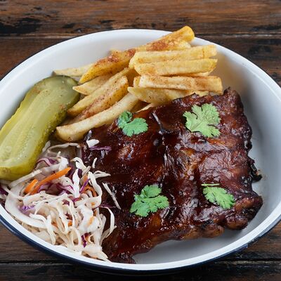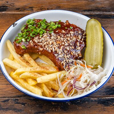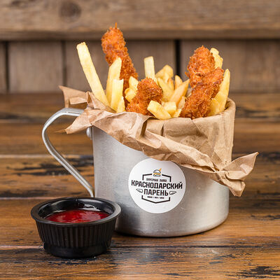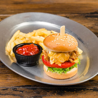 Говяжья котлета с фри, кетчупом и овощами доставка