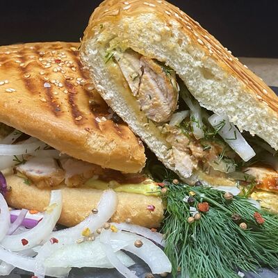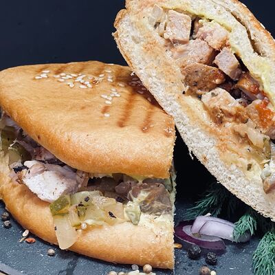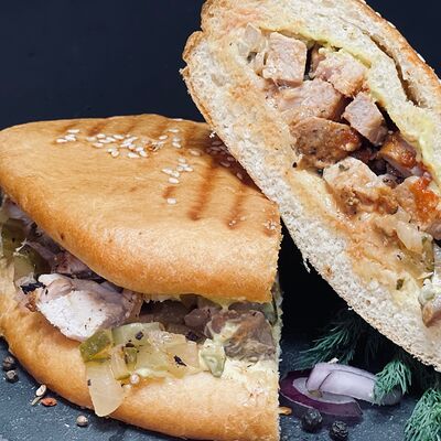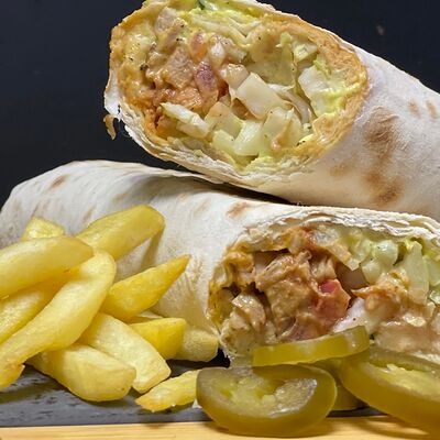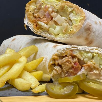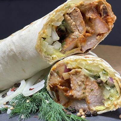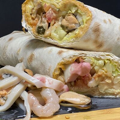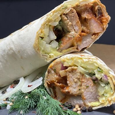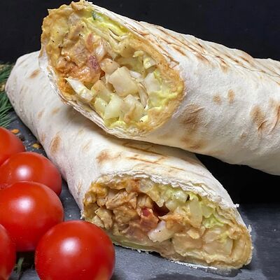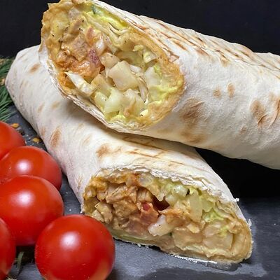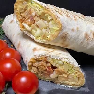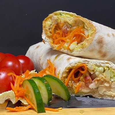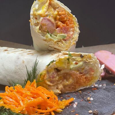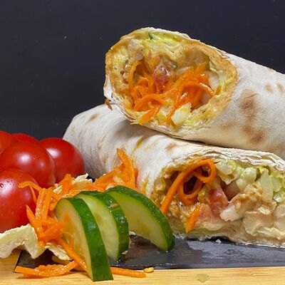 Корейская морковь, сосиска, помидоры, огурцы, авторские соусы, армянский лаваш
