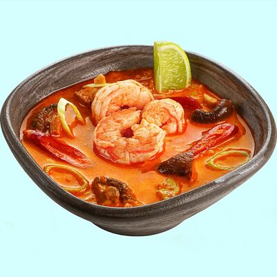 Бульон Том Ям, Куриное филе, Грибы шиитаке, Лук-порей, Лайм, Чили перец, Рис, Кокосовое молоко