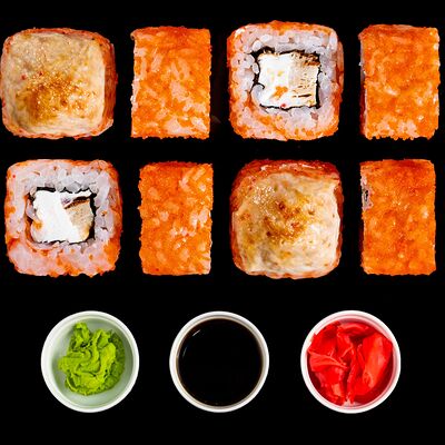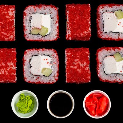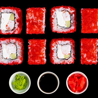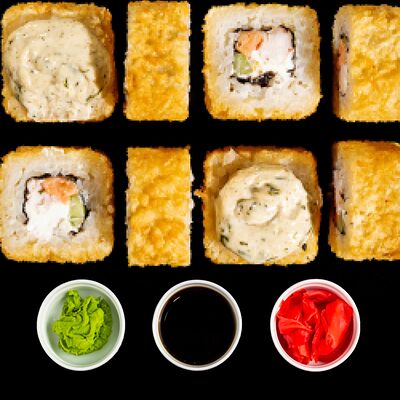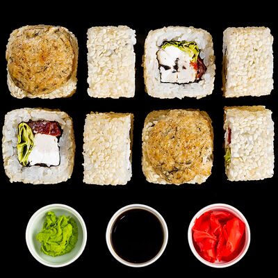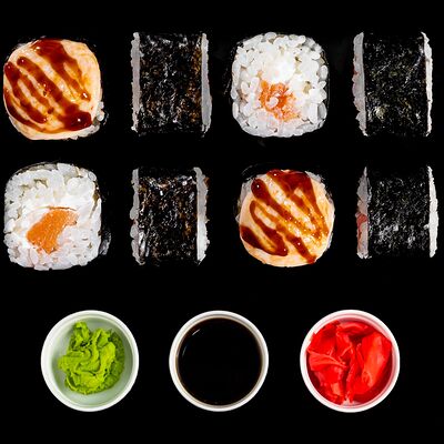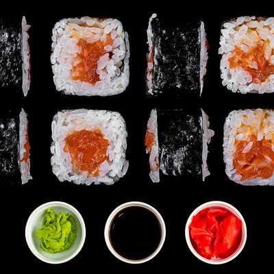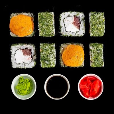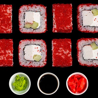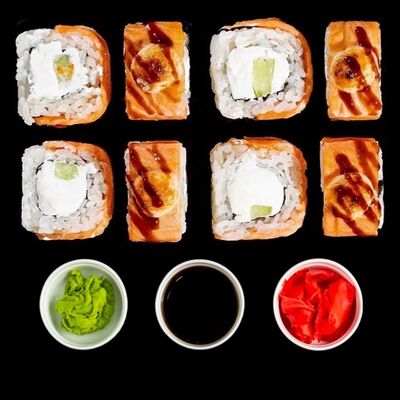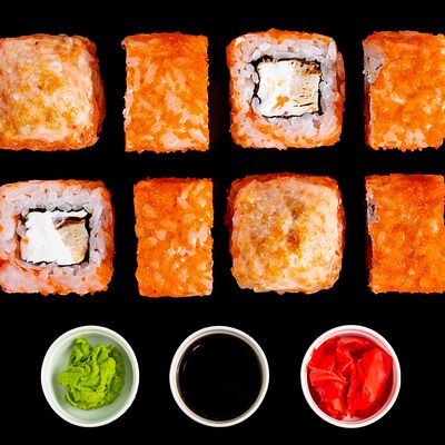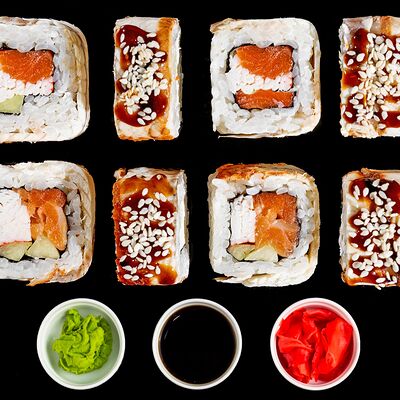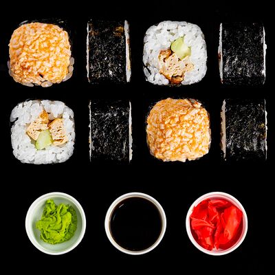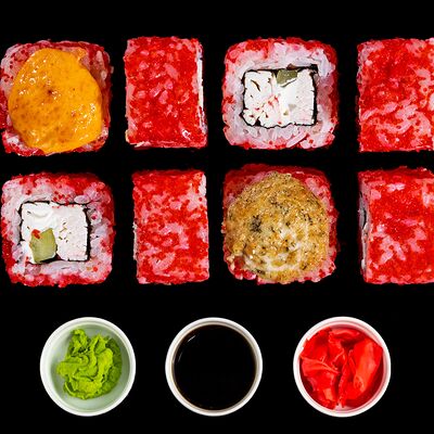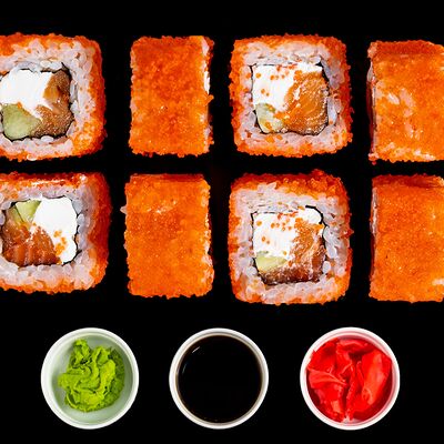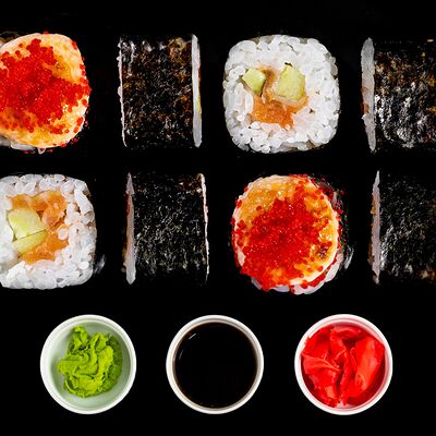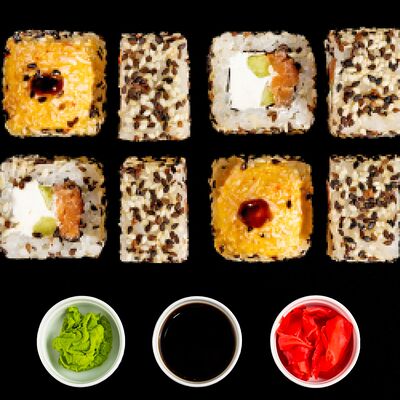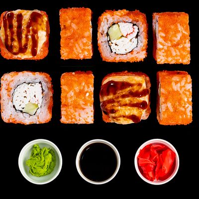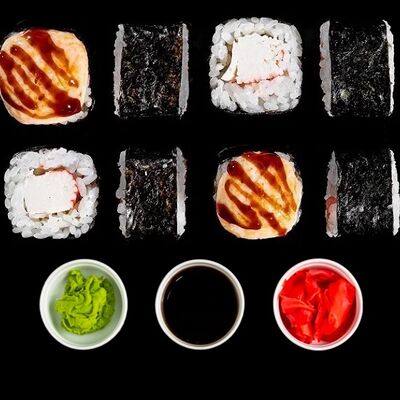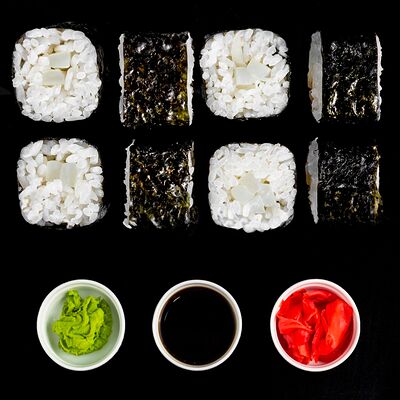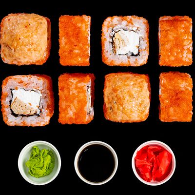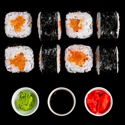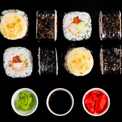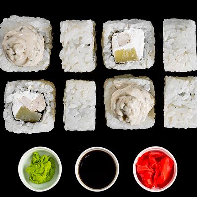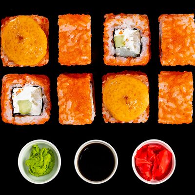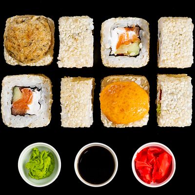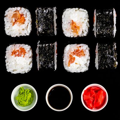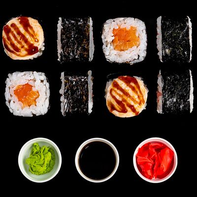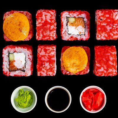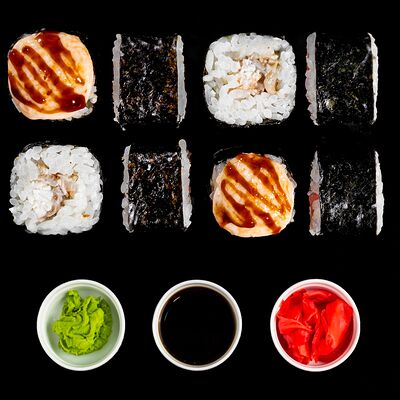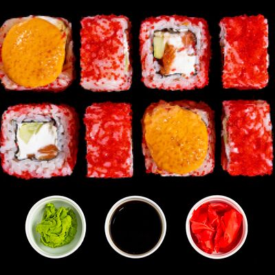 Японский омлет (яйца, молоко), огурец, лосось, соус спайси (8 шт.). Васаби (1 порция), имбирь (1 порция), соевый соус (1 порция)