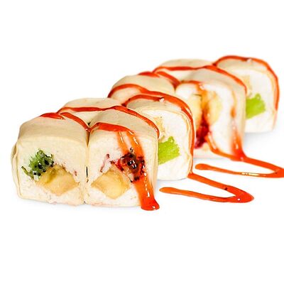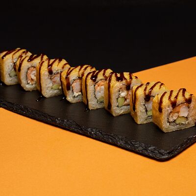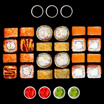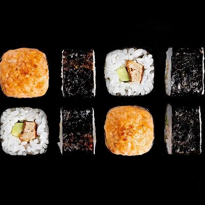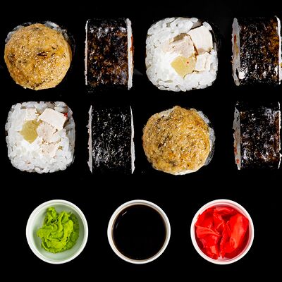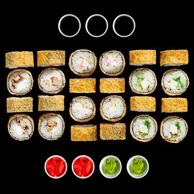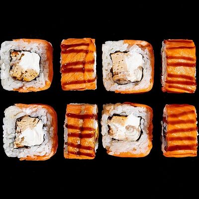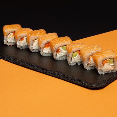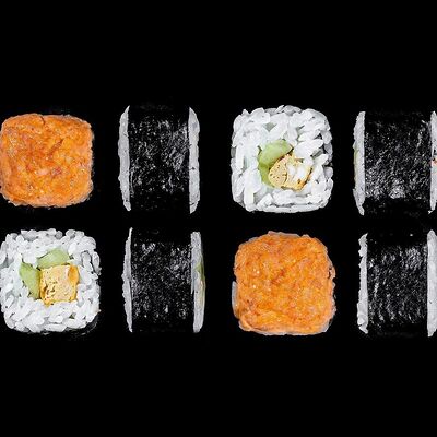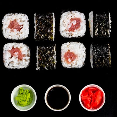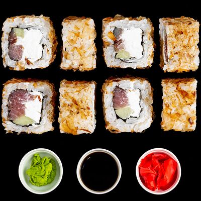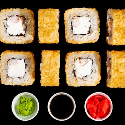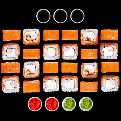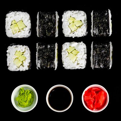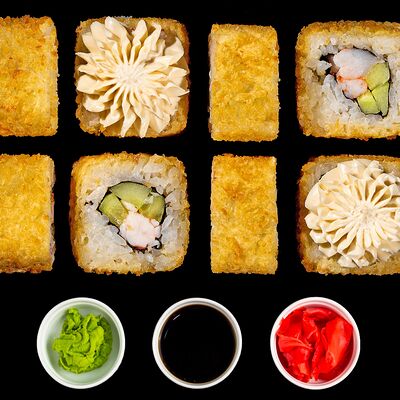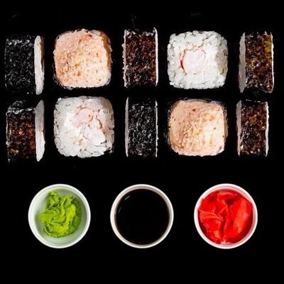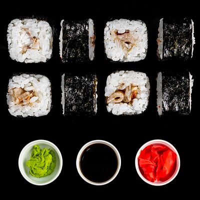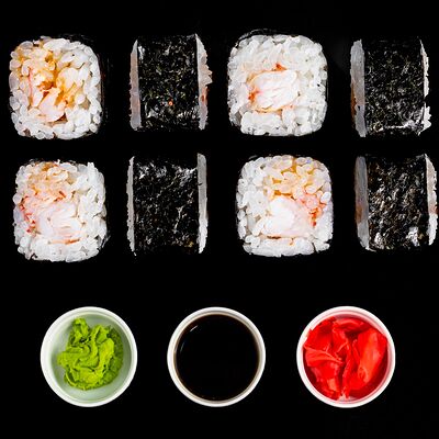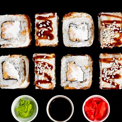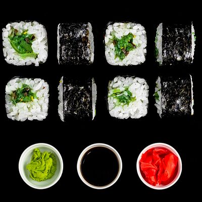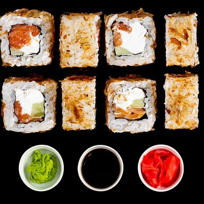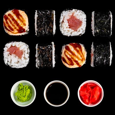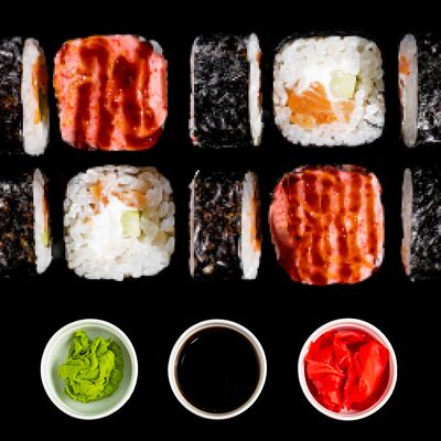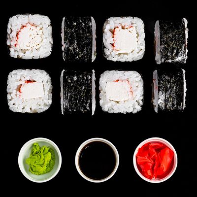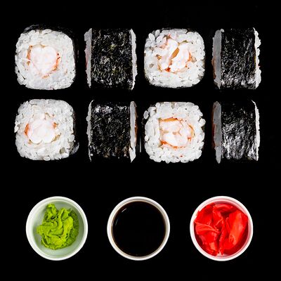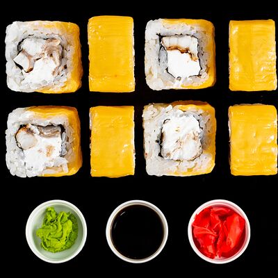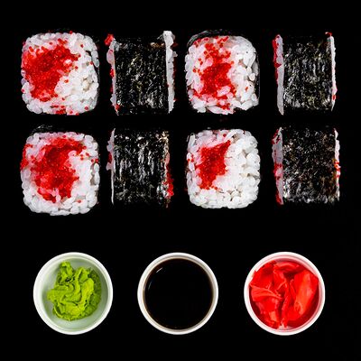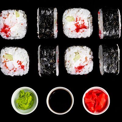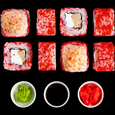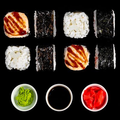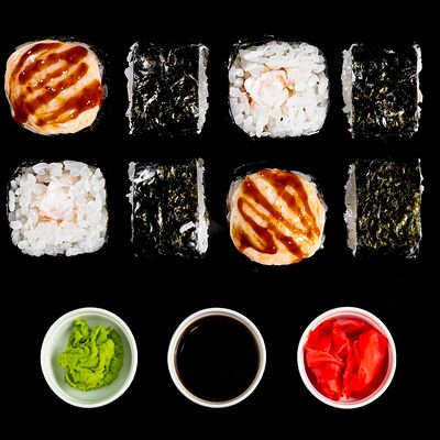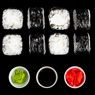 Японский омлет (яйца, молоко), огурец, лосось, соус спайси (8 шт.). Васаби (1 порция), имбирь (1 порция), соевый соус (1 порция)