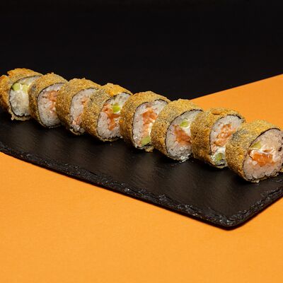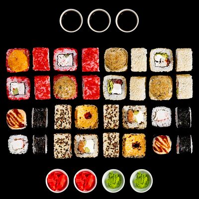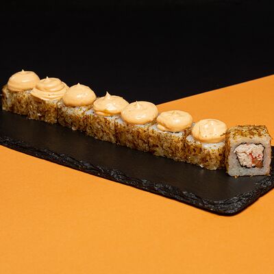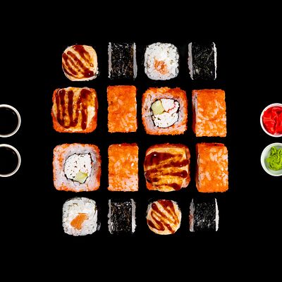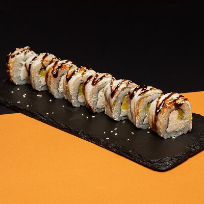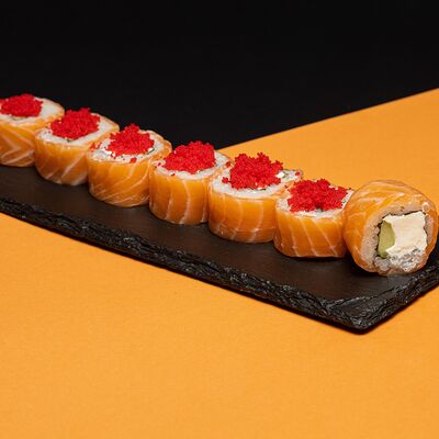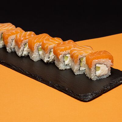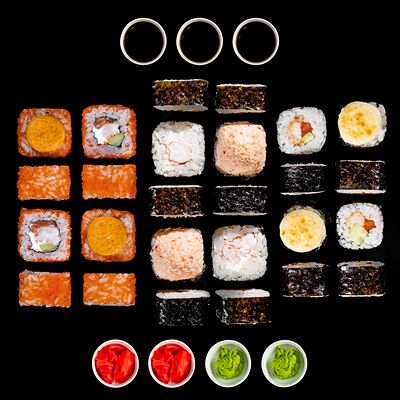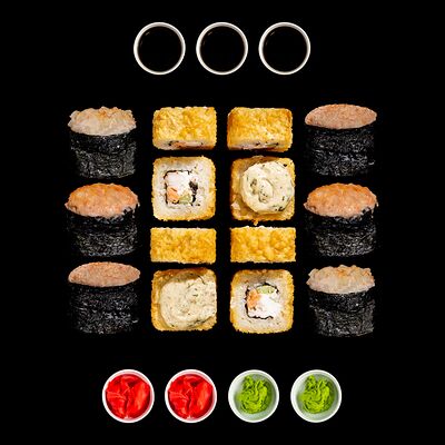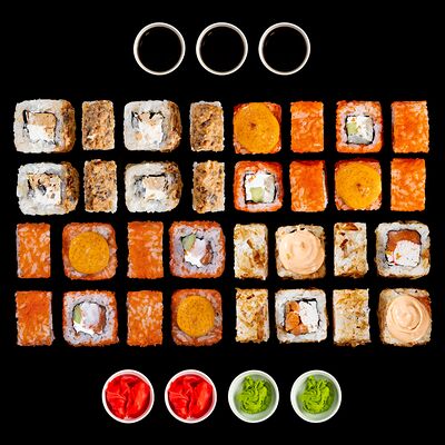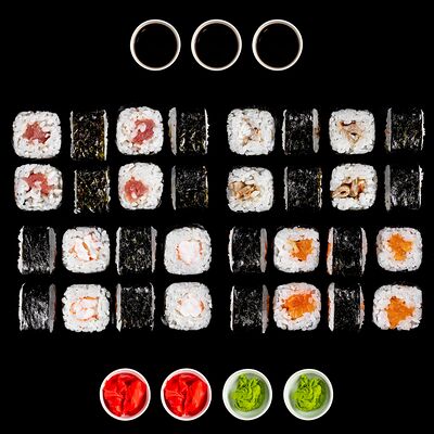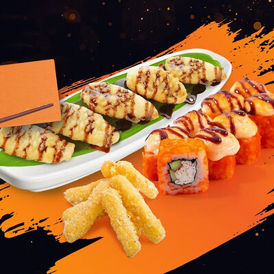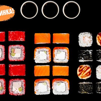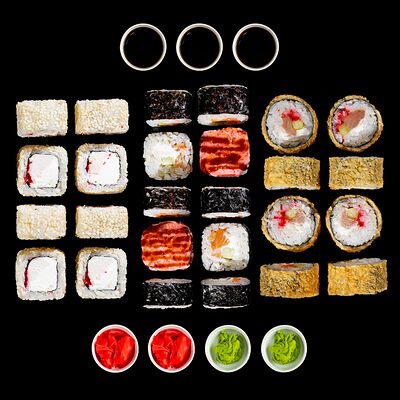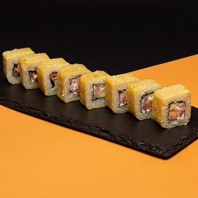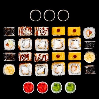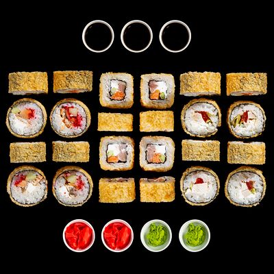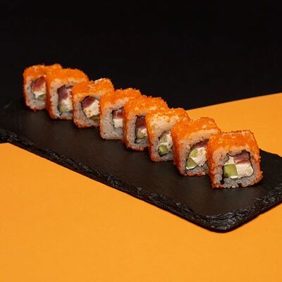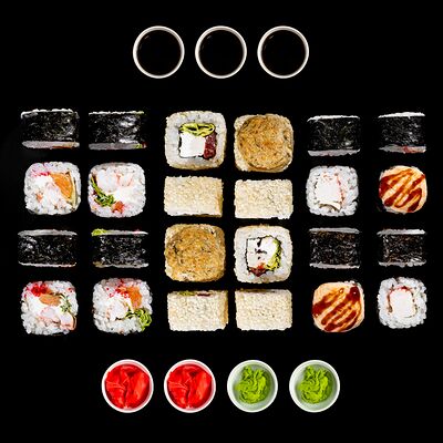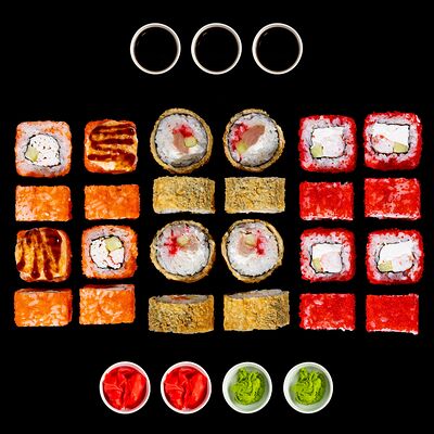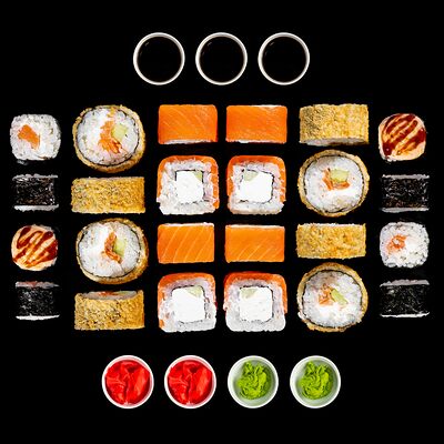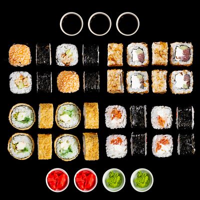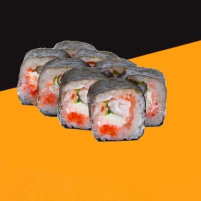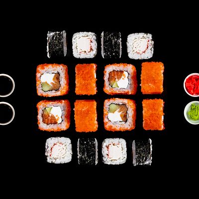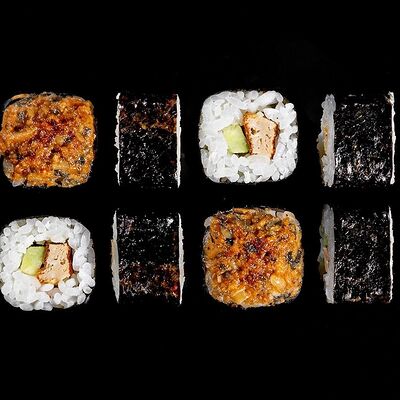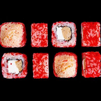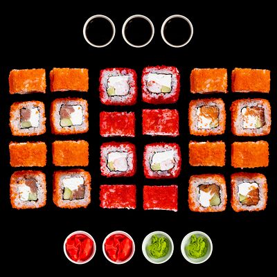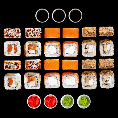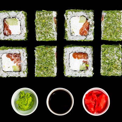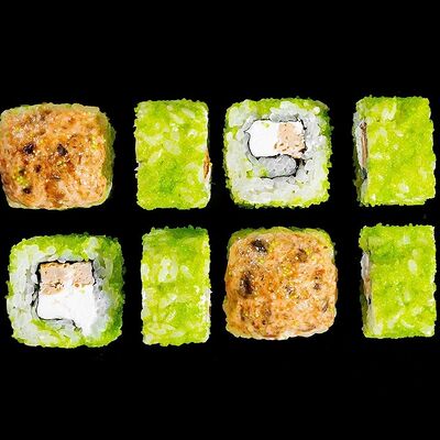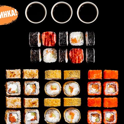 Японский омлет (яйца, молоко), огурец, лосось, соус спайси (8 шт.). Васаби (1 порция), имбирь (1 порция), соевый соус (1 порция)