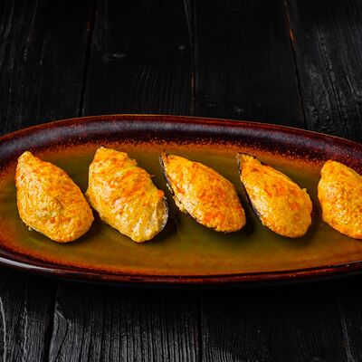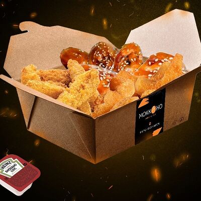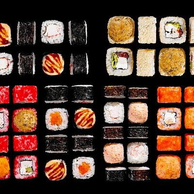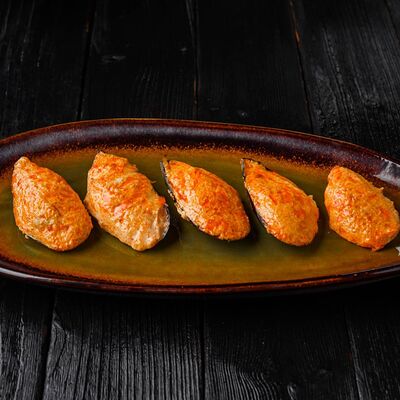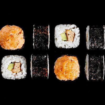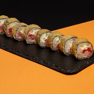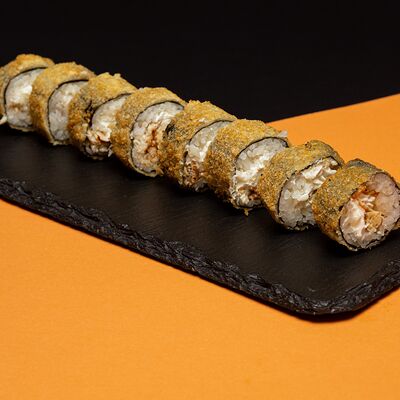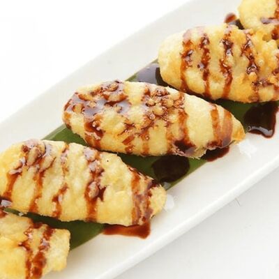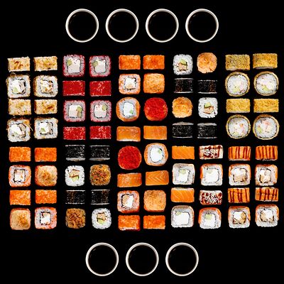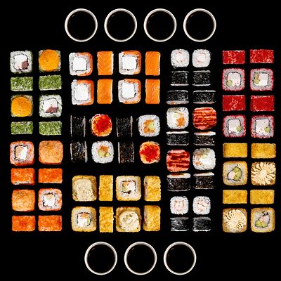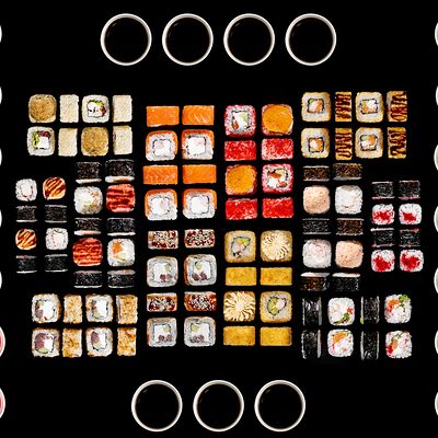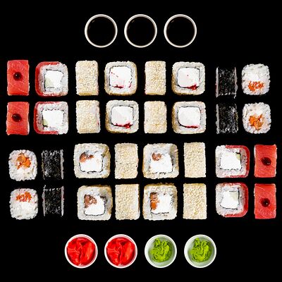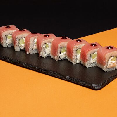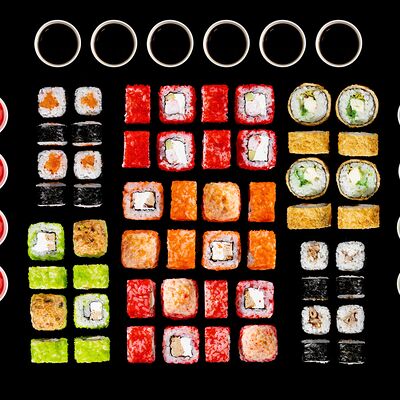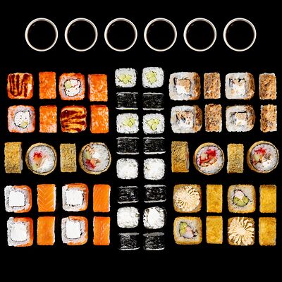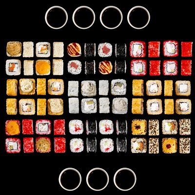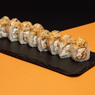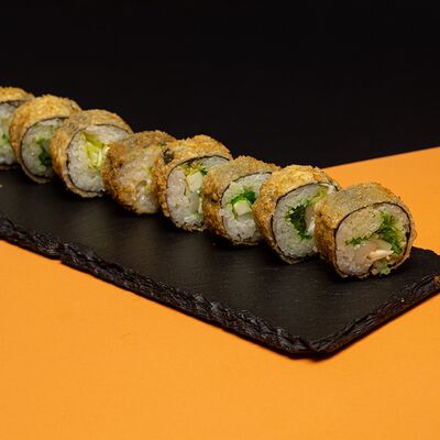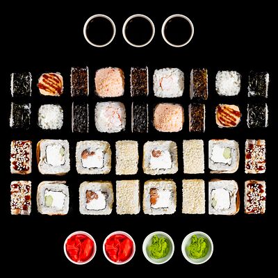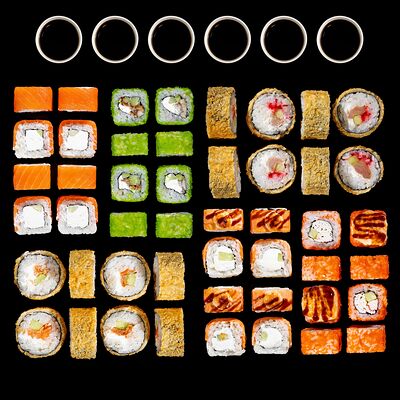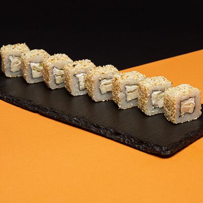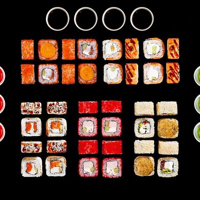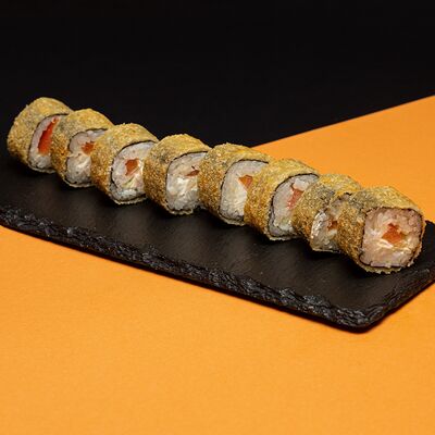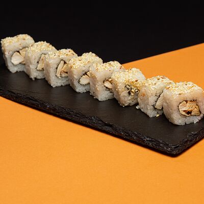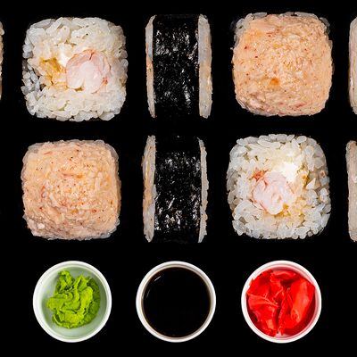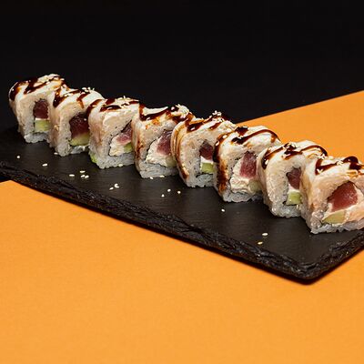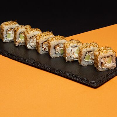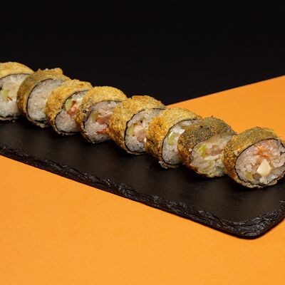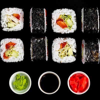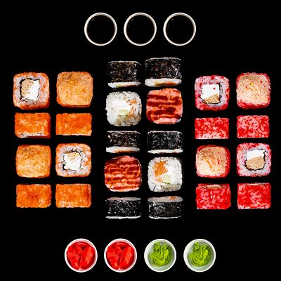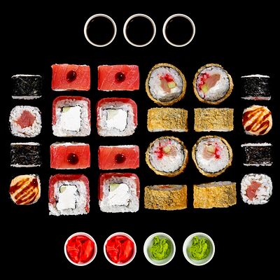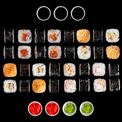 Японский омлет (яйца, молоко), огурец, лосось, соус спайси (8 шт.). Васаби (1 порция), имбирь (1 порция), соевый соус (1 порция)