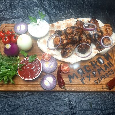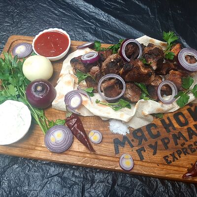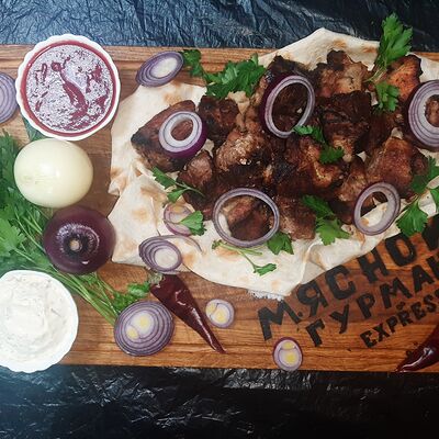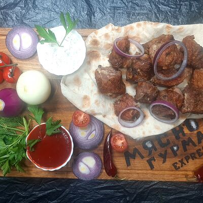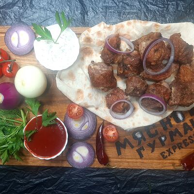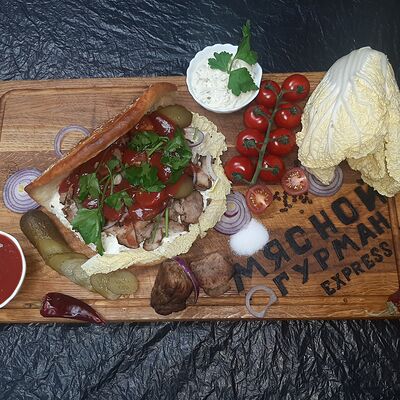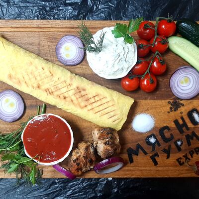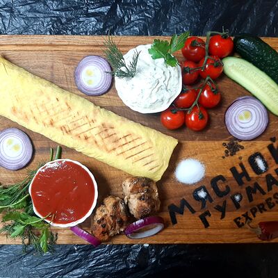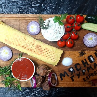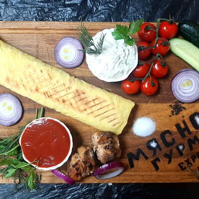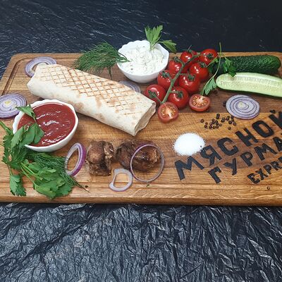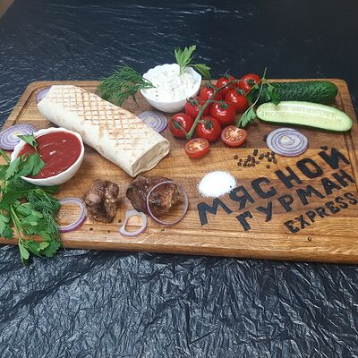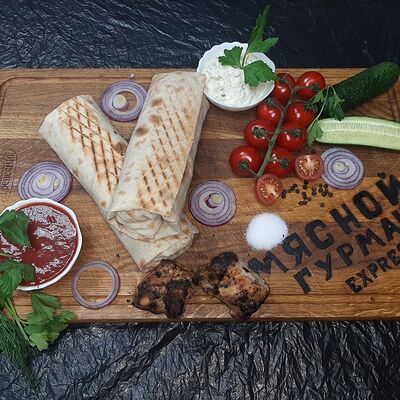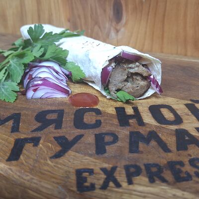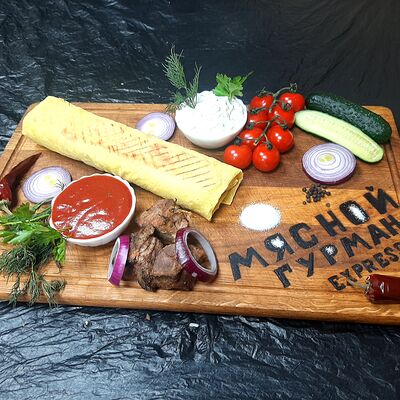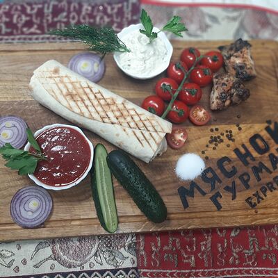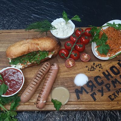 Лаваш белый, соус, корейская морковка, говяжья сосиска (75 г), горчичный соус, томатнтый соус, свежая петрушка