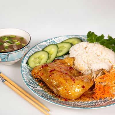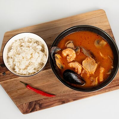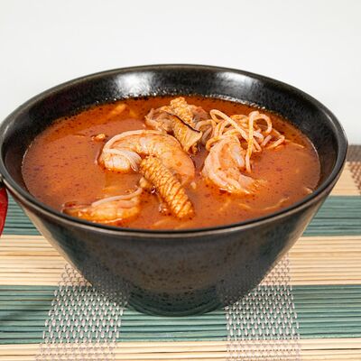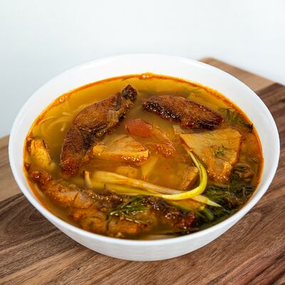 Карп или красная рыба (на выбор) на томатном бульоне. Рисовая вермишель, филе рыбы, ананас, помидор, тамаринд