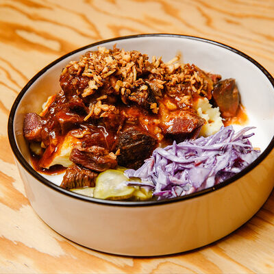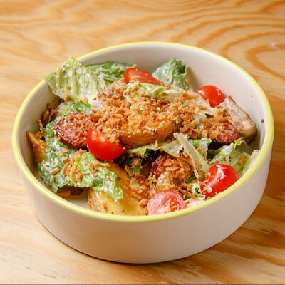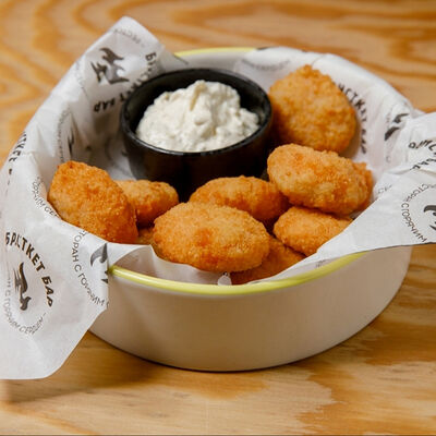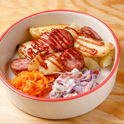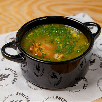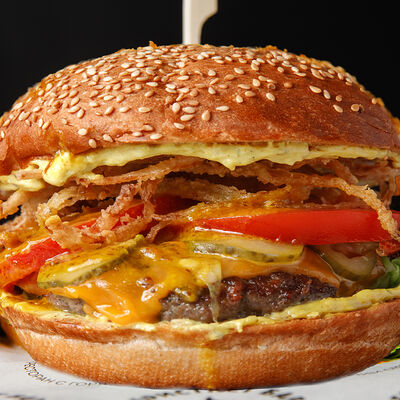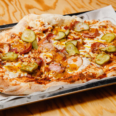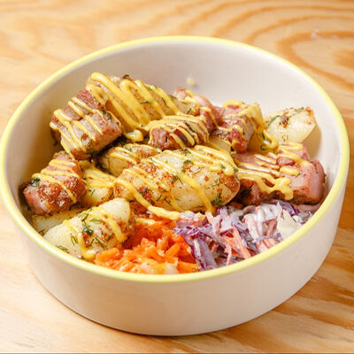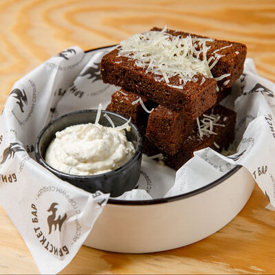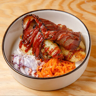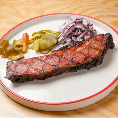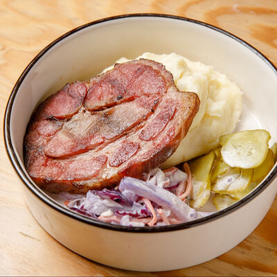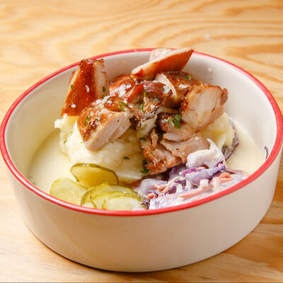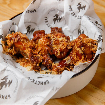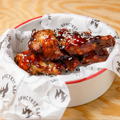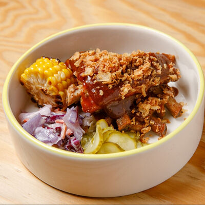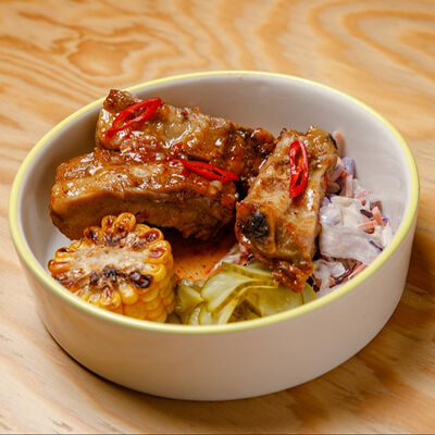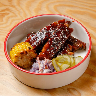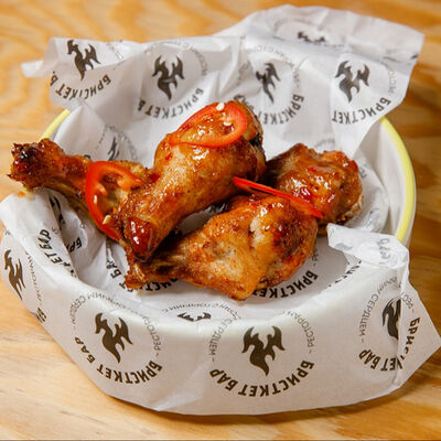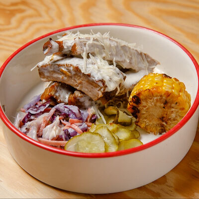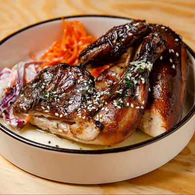 Половину цыпленка готовим в техасском смокере, подаём в сливочном масле с чесноком, кинзой и кунжутом, корейской морковью, салатом Коул Слоу и огурцами