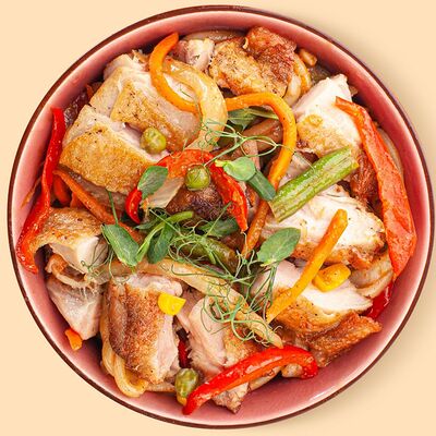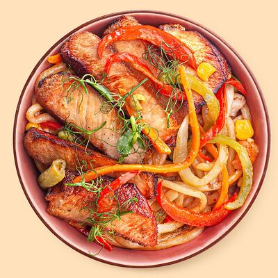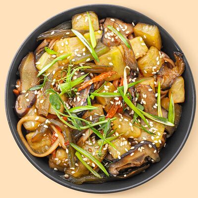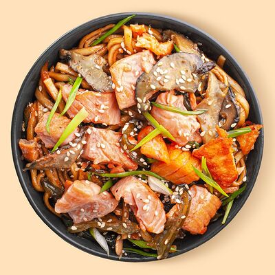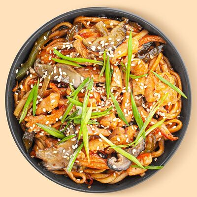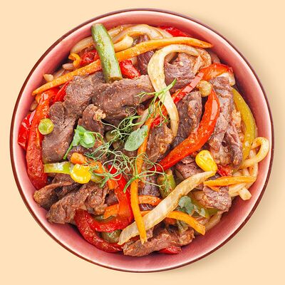 Свежая пшеничная лапша, говядина (зерновой откорм), пекинская капуста, стручковая фасоль, зеленый горошек, кукурузные зерна, морковь по-корейски, перец болгарский, нежный соус с 7 секретными китайскими специями, украшается зеленым луком