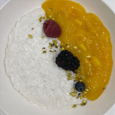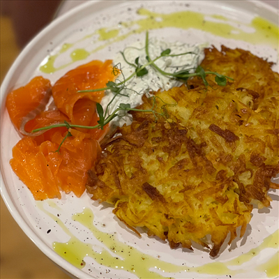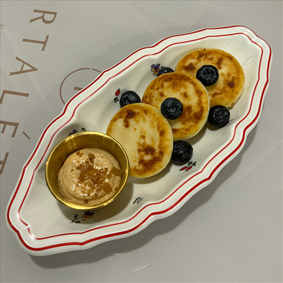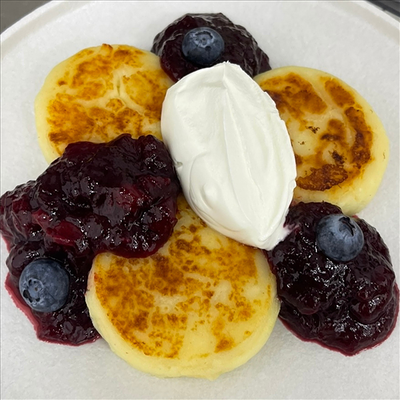 Сырники на основе деревенского творога, сливочный крем с вареной сгущенкой, свежие ягоды