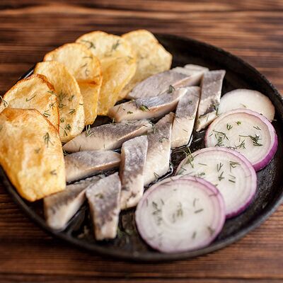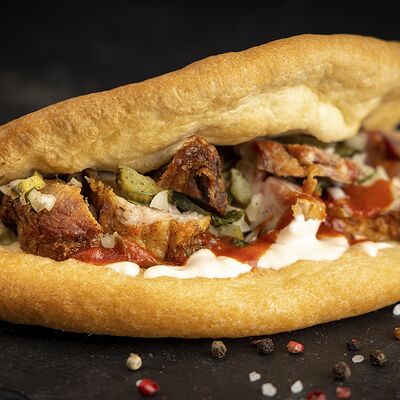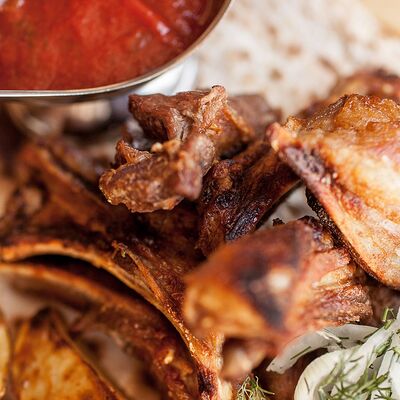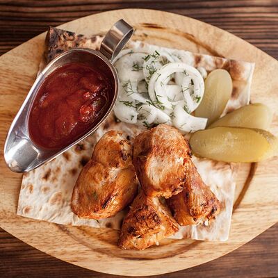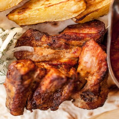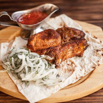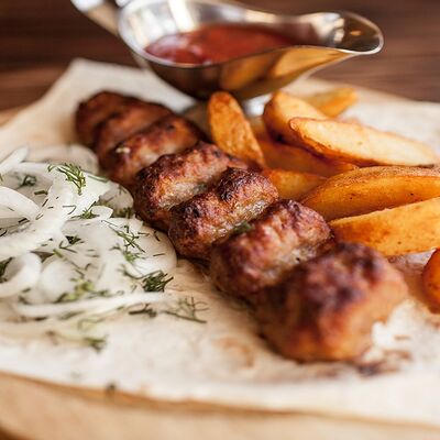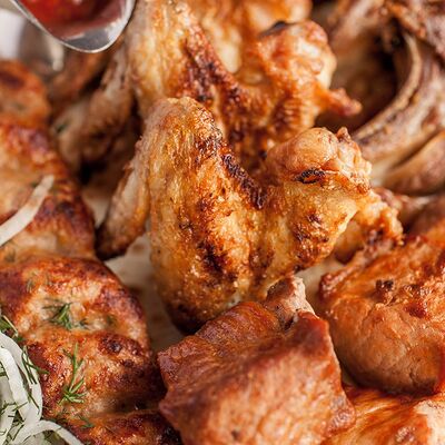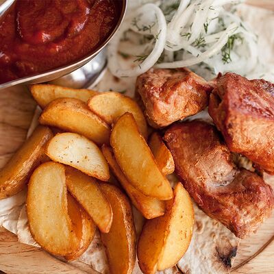 Сочетание мяса свинины, говядины, курицы. Подается с маринованным луком, картофелем и фирменным красным соусом