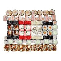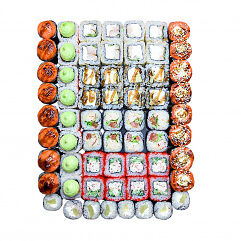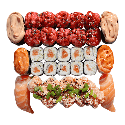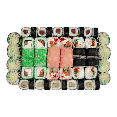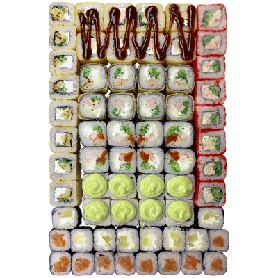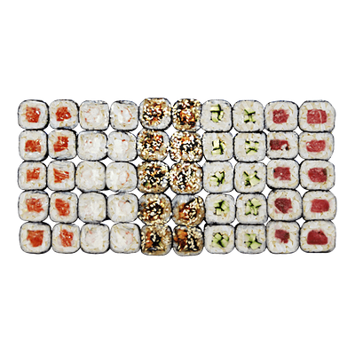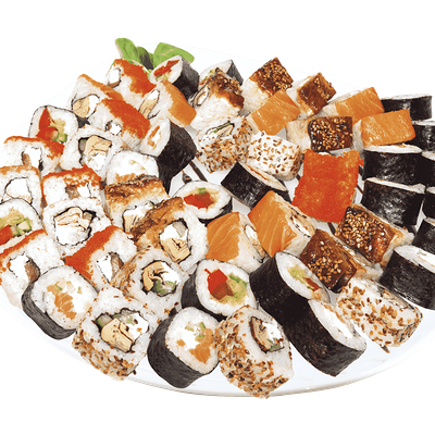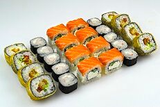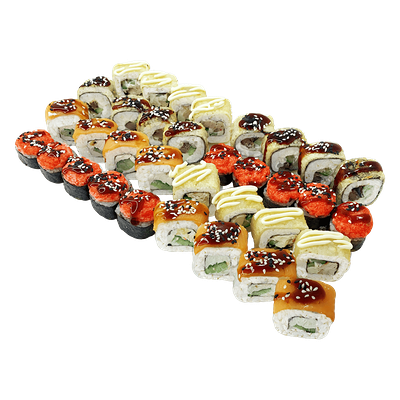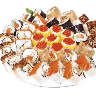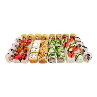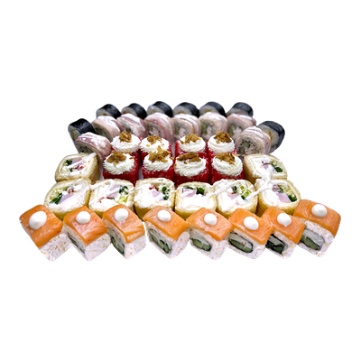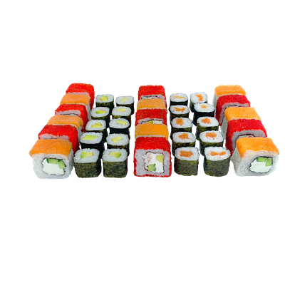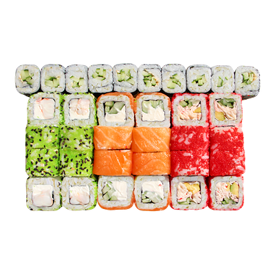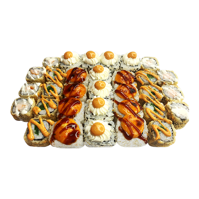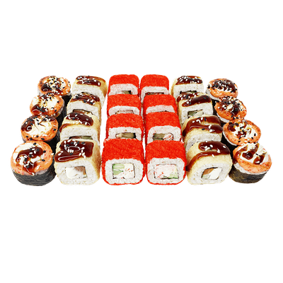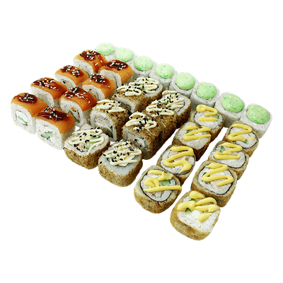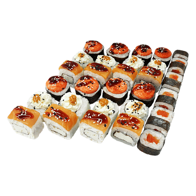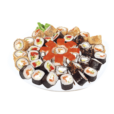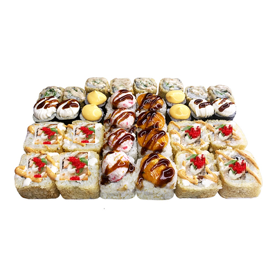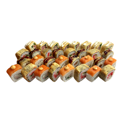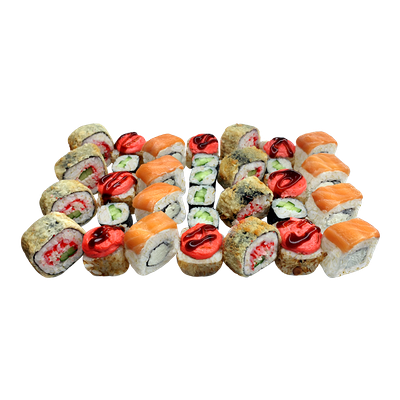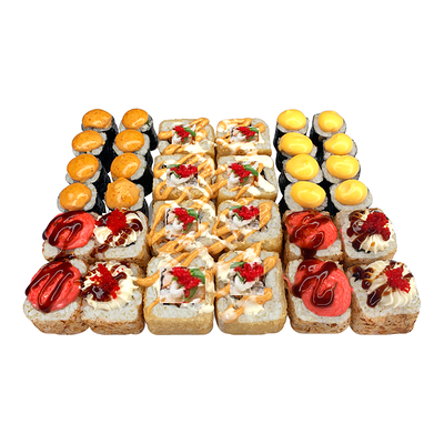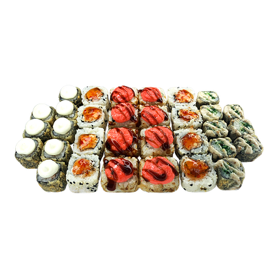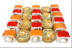 Хрустящий лосось, запеченный лосось (1/2) порции, запеченная креветка (1/2) порции, запеченная курица, грин (1/2) порции, банзай (1/2) порции. В сете (36) шт. Специи и приборы необходимо приобретать отдельно. Хранить 12 часов при t от2°С до 6°с