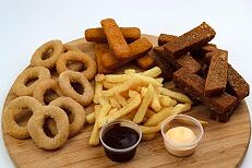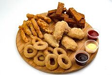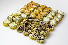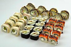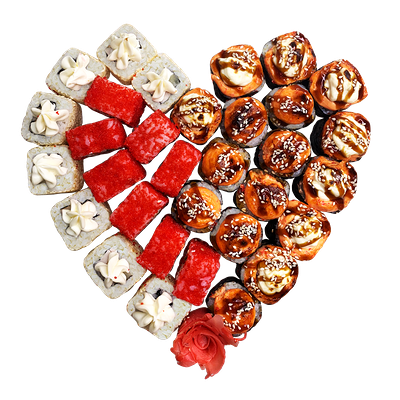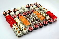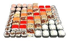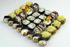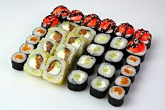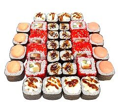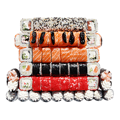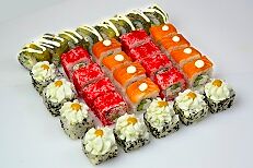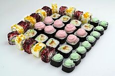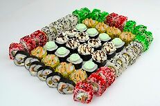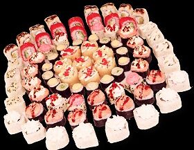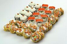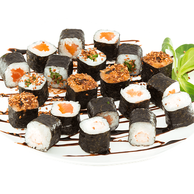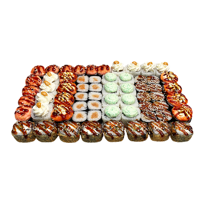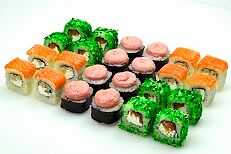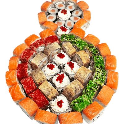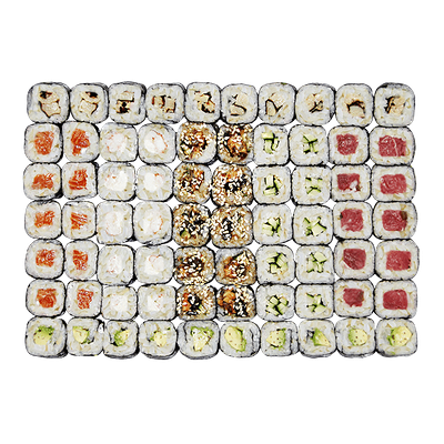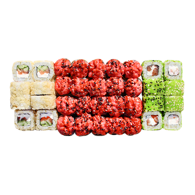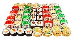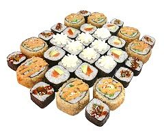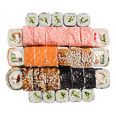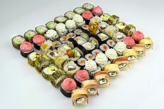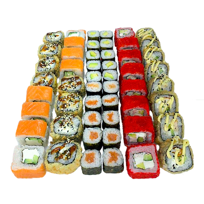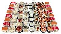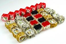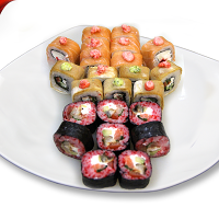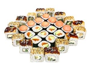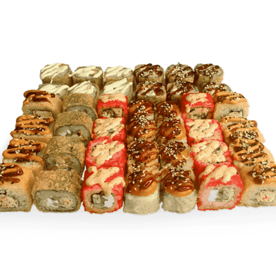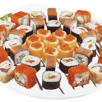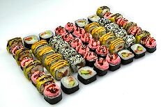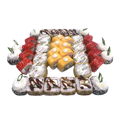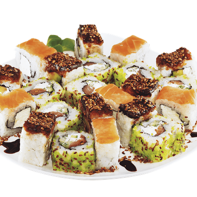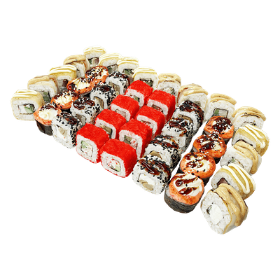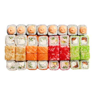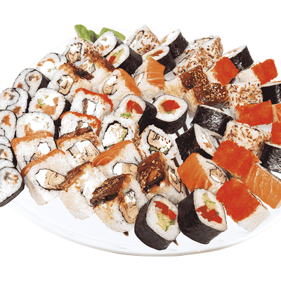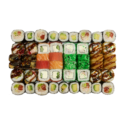 Хрустящий лосось, запеченный лосось (1/2) порции, запеченная креветка (1/2) порции, запеченная курица, грин (1/2) порции, банзай (1/2) порции. В сете (36) шт. Специи и приборы необходимо приобретать отдельно. Хранить 12 часов при t от2°С до 6°с