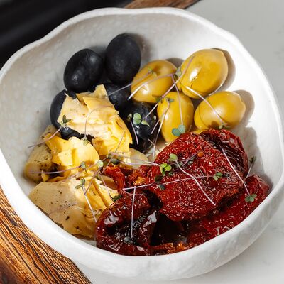 Цукини, баклажаны, вешенки, перец болгарский, лук репчатый, оливковое масло