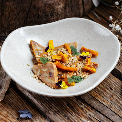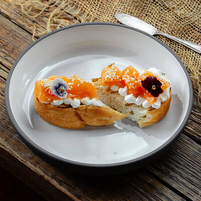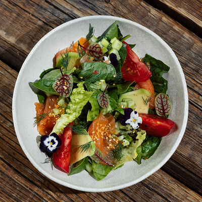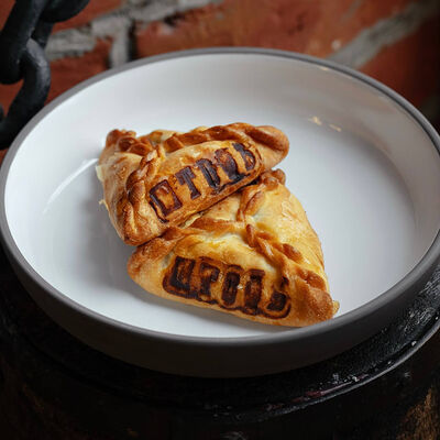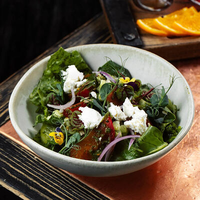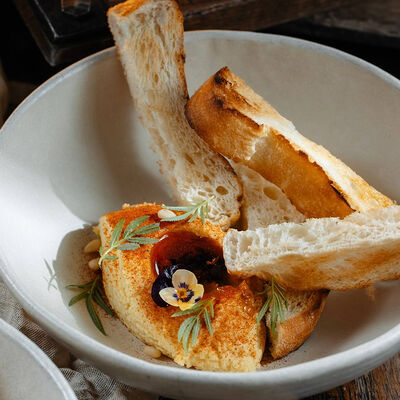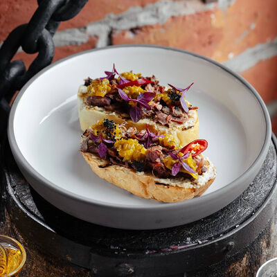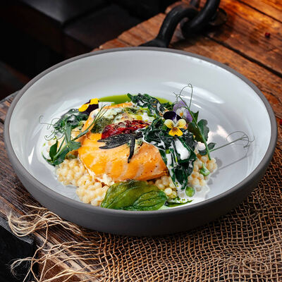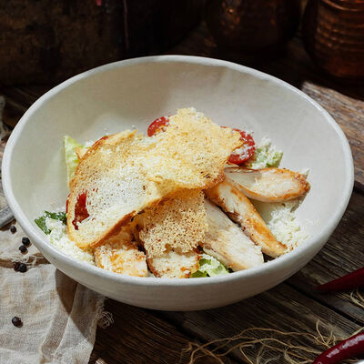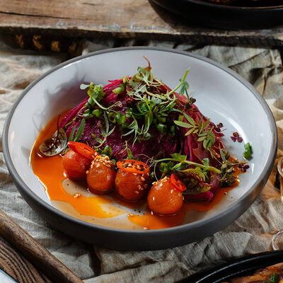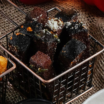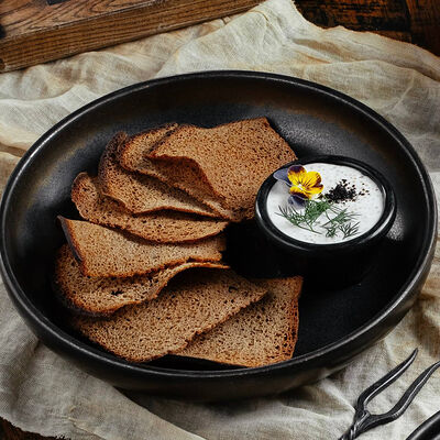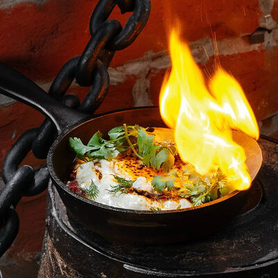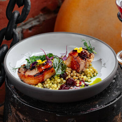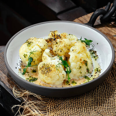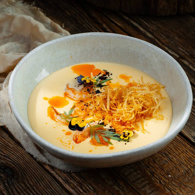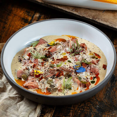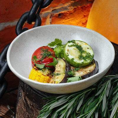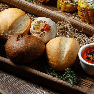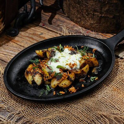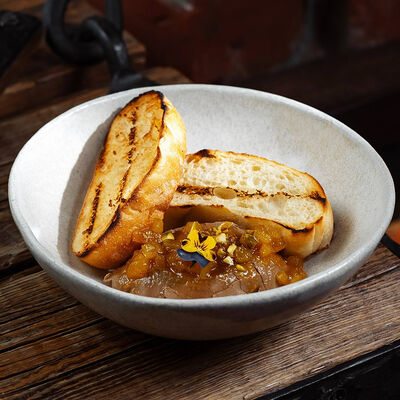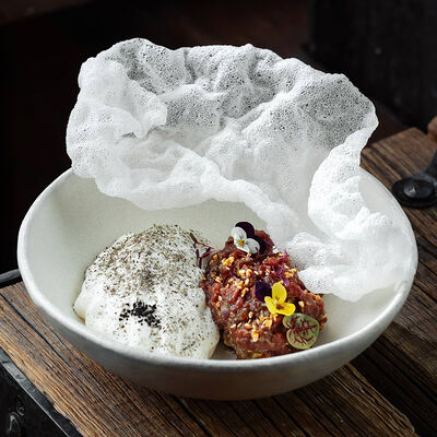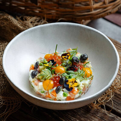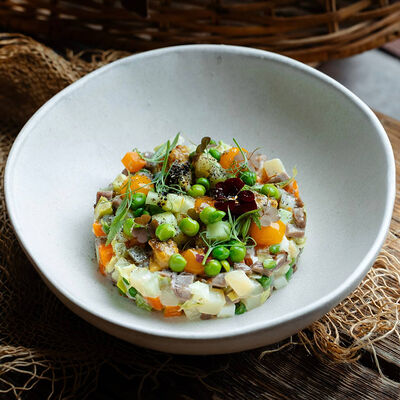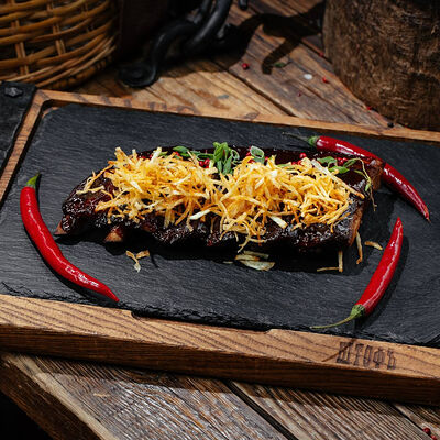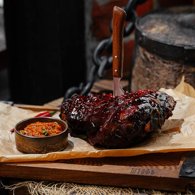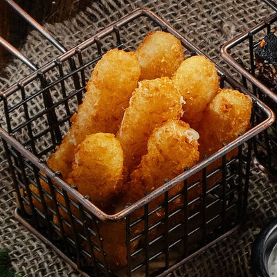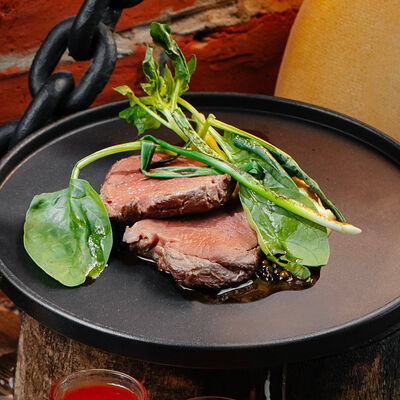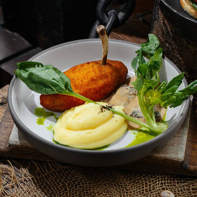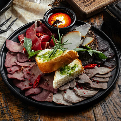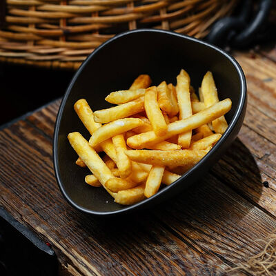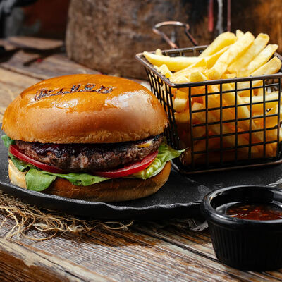 Котлета из мраморной говядины, булочка из пшеничной муки, сезонные томаты, консервированные огурцы, сегмент красного лука, свежий айсберг, картофель фри, кетчуп, соус на основе айоли с трюфельной пастой