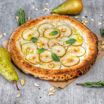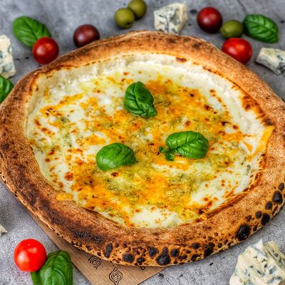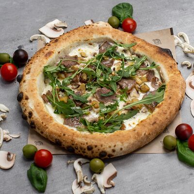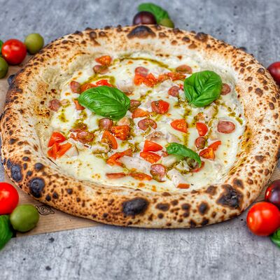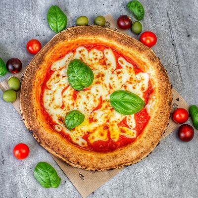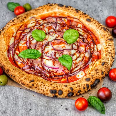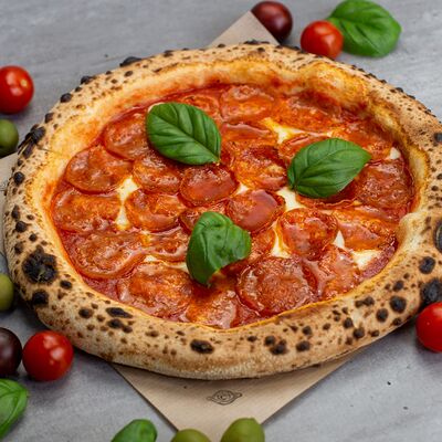 Пицца из дровяной печи. Соус из томатов, итальянские травы, моцарелла, оливковое масло, колбаски пепперони, базилик (28 см)