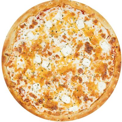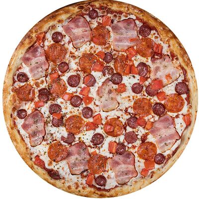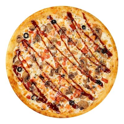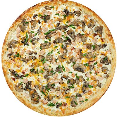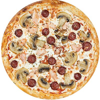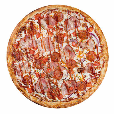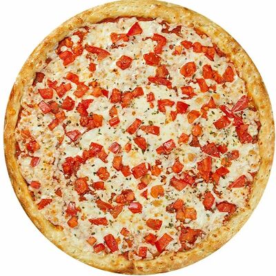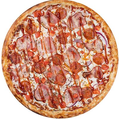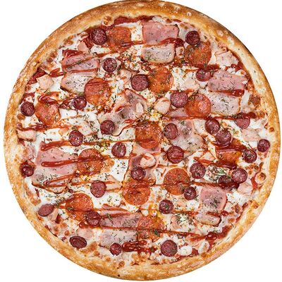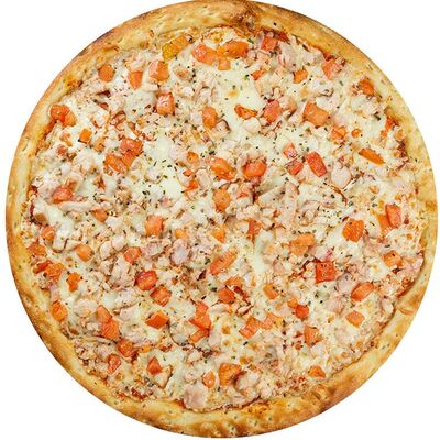Курица копченая, соус цезарь, капуста пекинская, помидоры, сыр моцарелла, сыр пармезан, сыр чеддер, масло чесночное, специи, тесто (30 см)