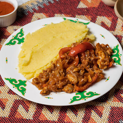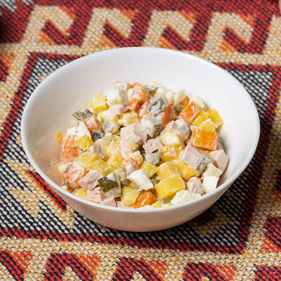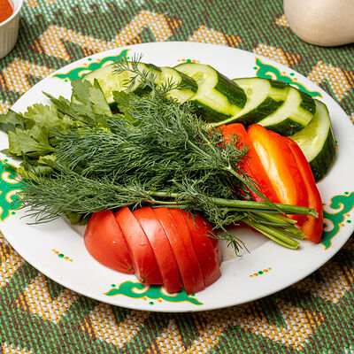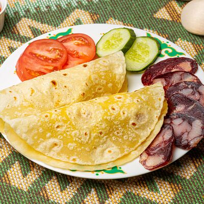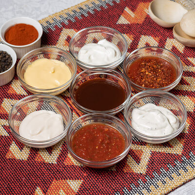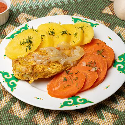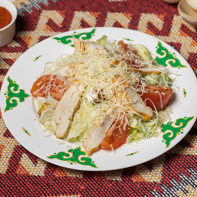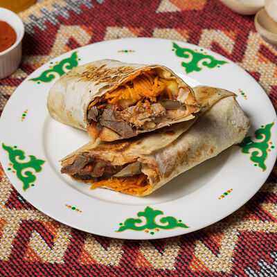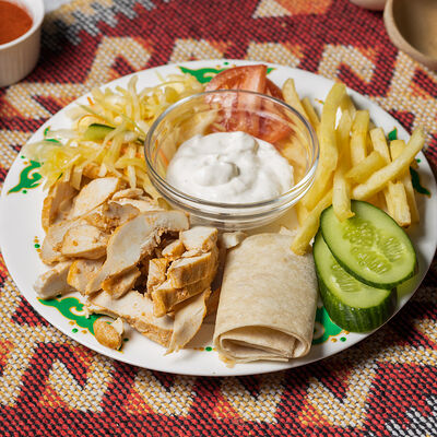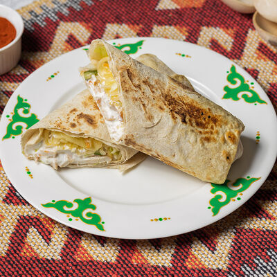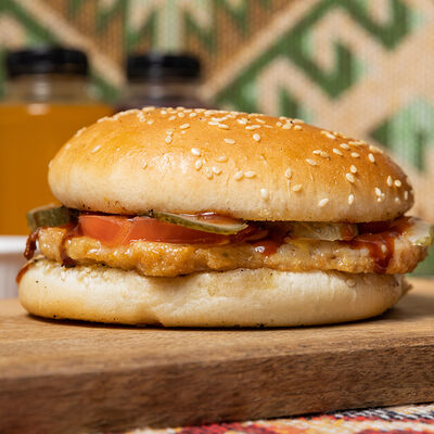 Курица, помидор, маринованные огурцы, сыр, соус с душицей, соус BBQ