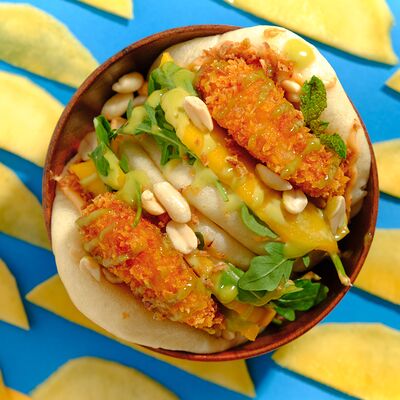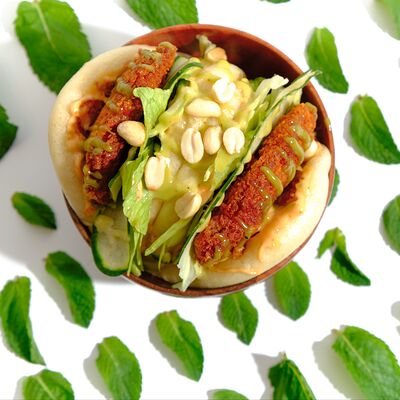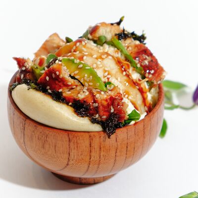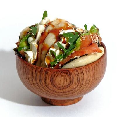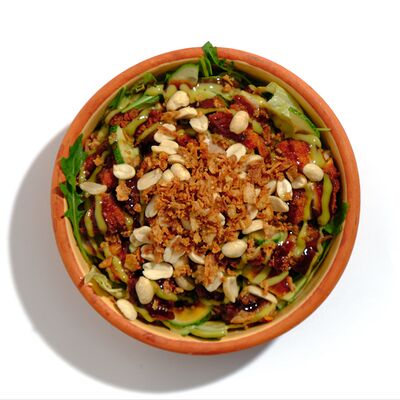 Курица в темпуре, айсберг, руккола, огурец, арахис, жареный лук, соус унаги, соус с васаби
