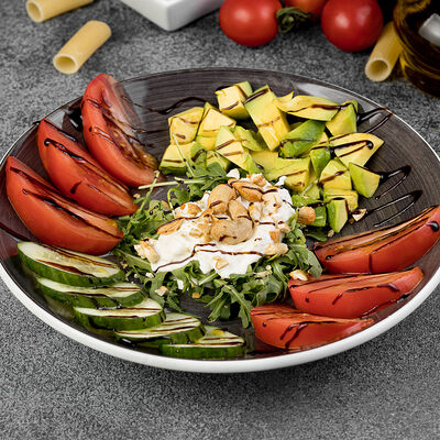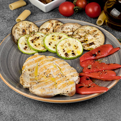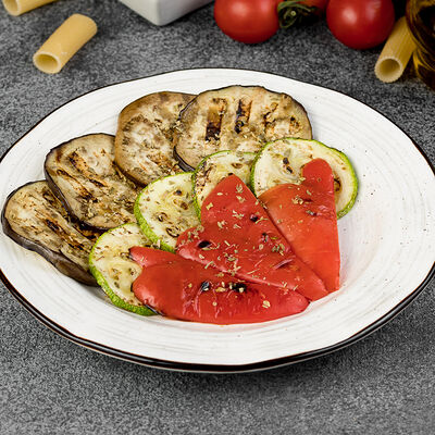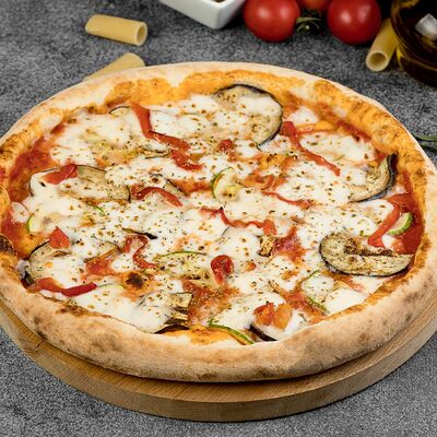 Соус томатный, сыр моцарелла, баклажаны, цукини, болгарский перец, масло оливковое, орегано (32 см)