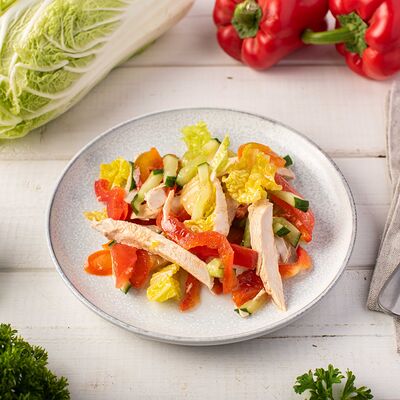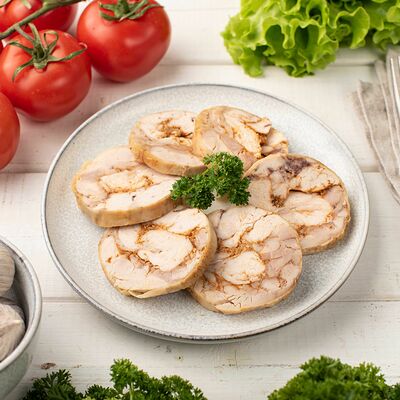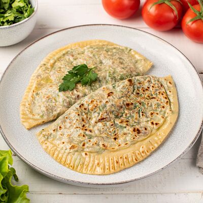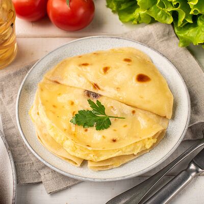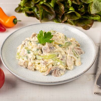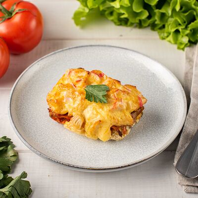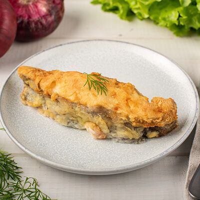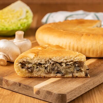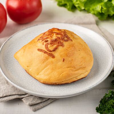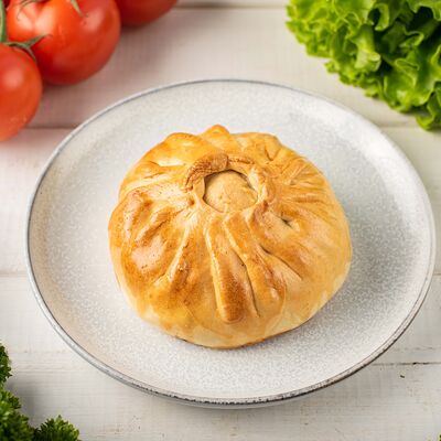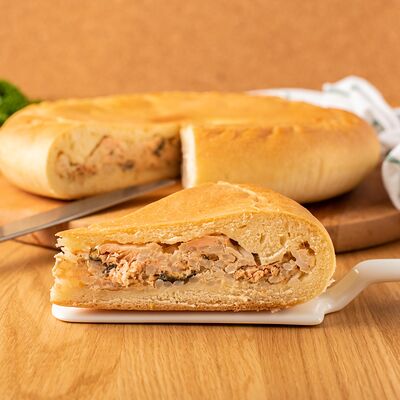 Дрожжевое тесто на сметане, начинка: тушка цыпленка, яйца куриные, сыр, огурцы соленые, масло сливочное, соль, перец