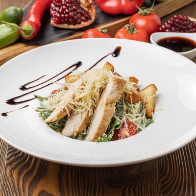 Романо, куриная грудка, помидор черри, гренки, сыр пармезан, заправляется соусом цезарь