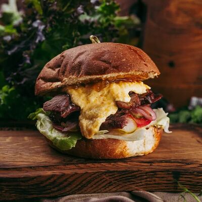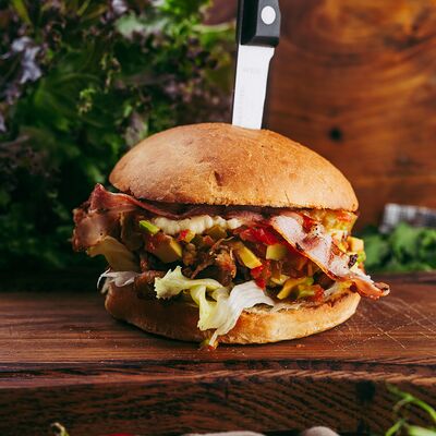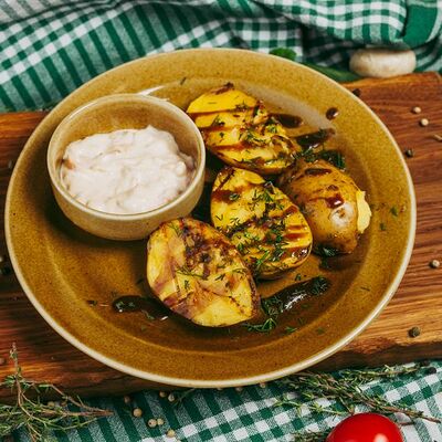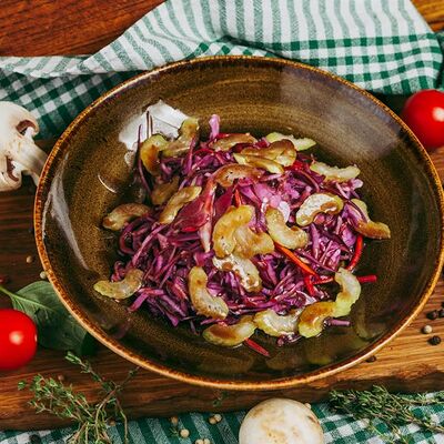 Баранья грудинка, тушенная с капустой, запечённый картофель и зелёный горошек