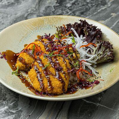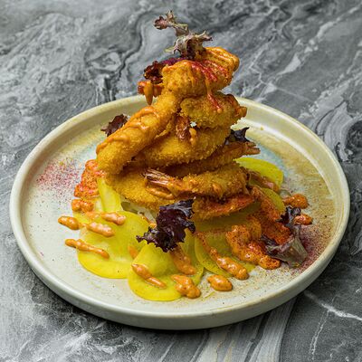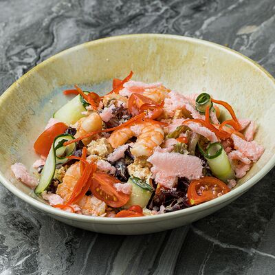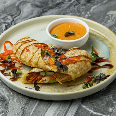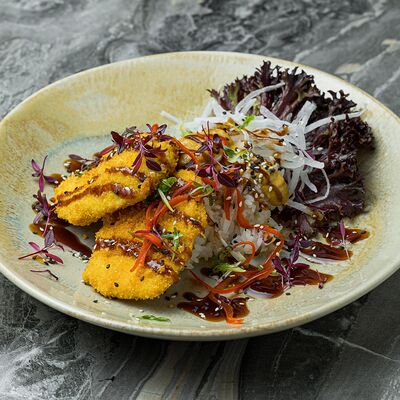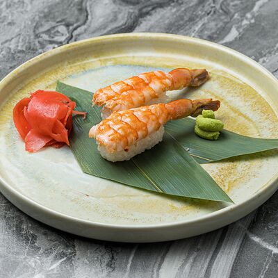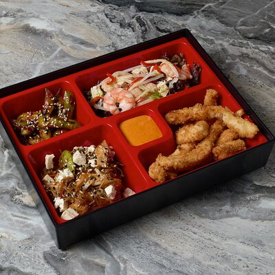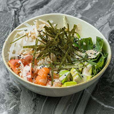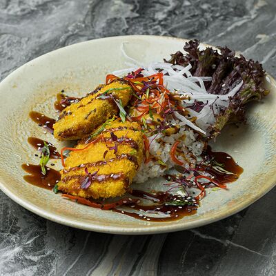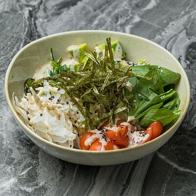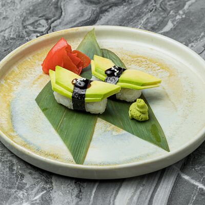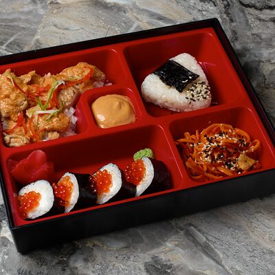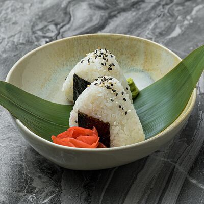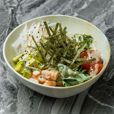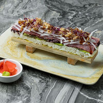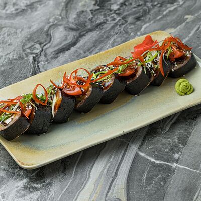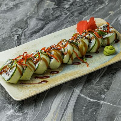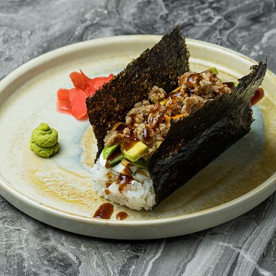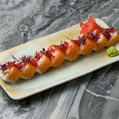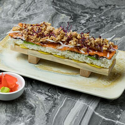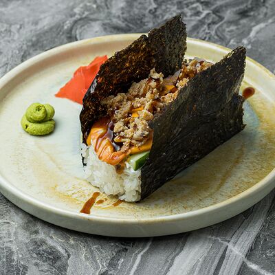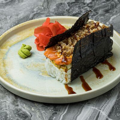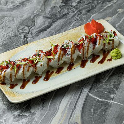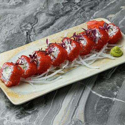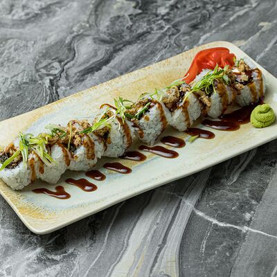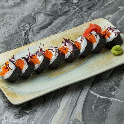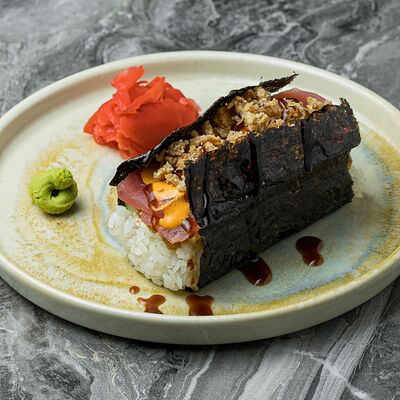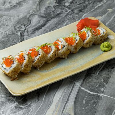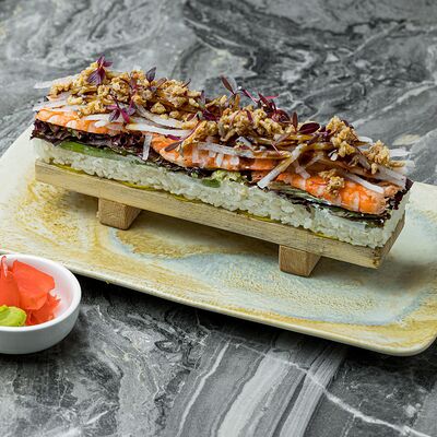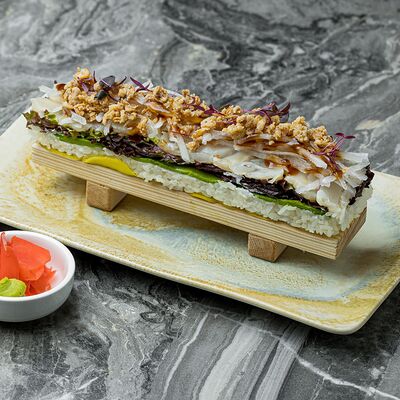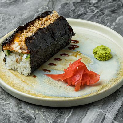 Рис, нори, сливочный сыр, огурец, соус гуакамоле, соус спайси, соус терияки, жареный лук, креветка