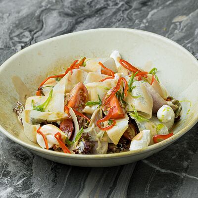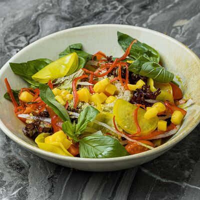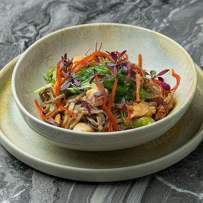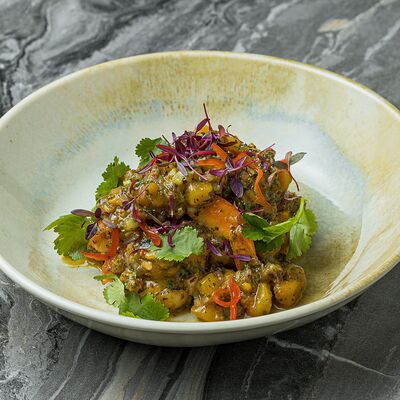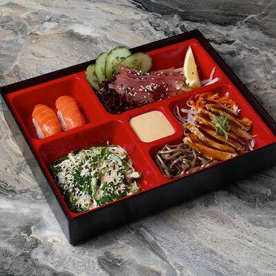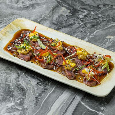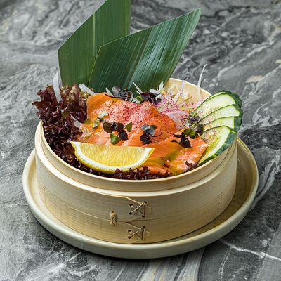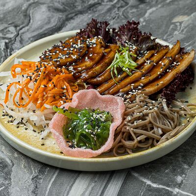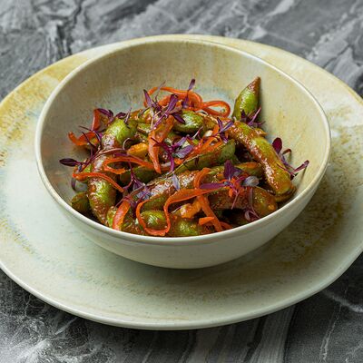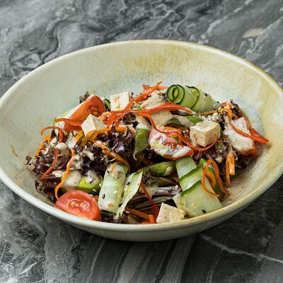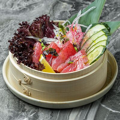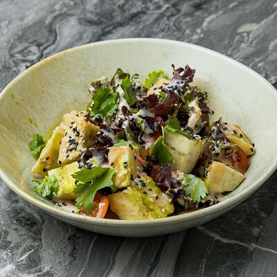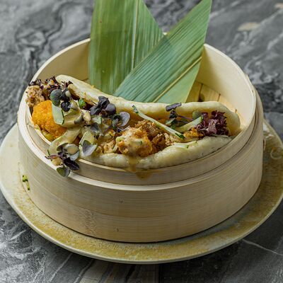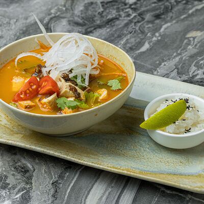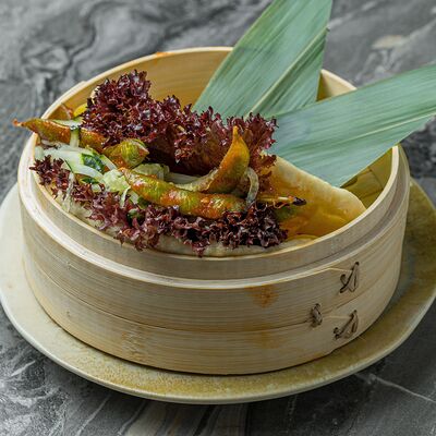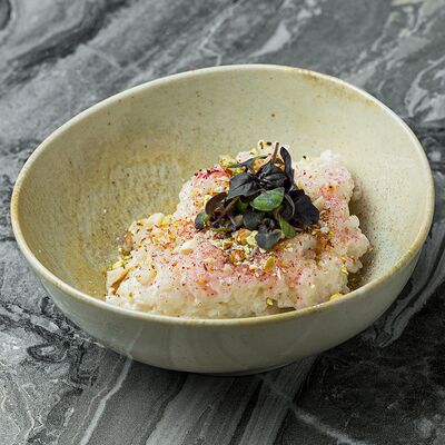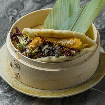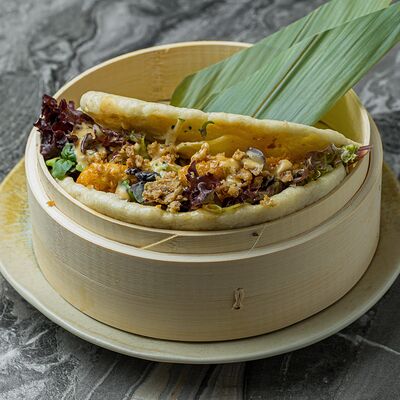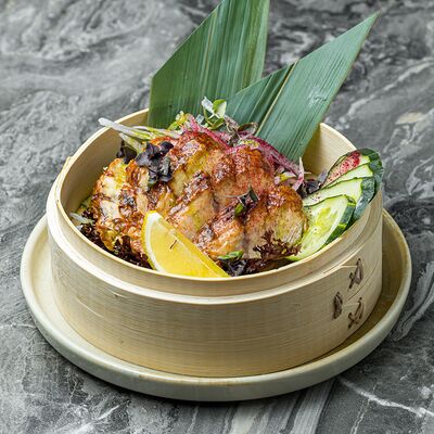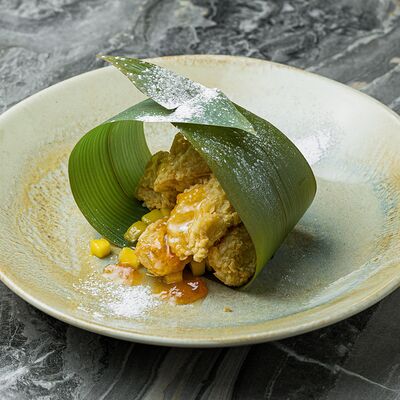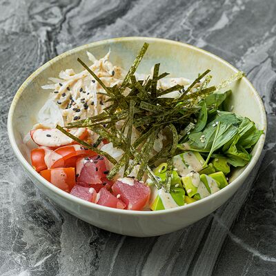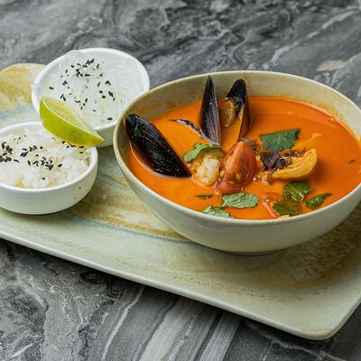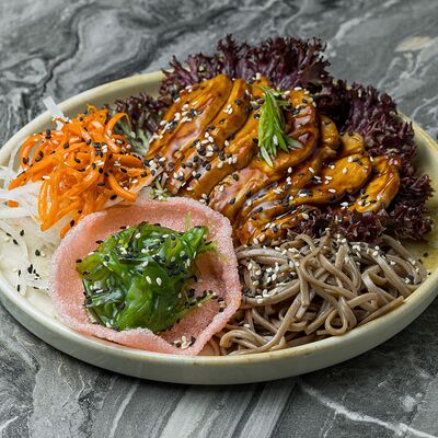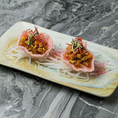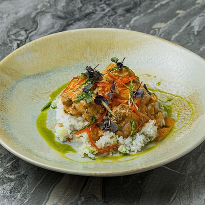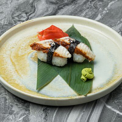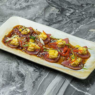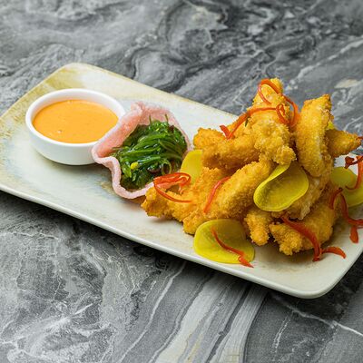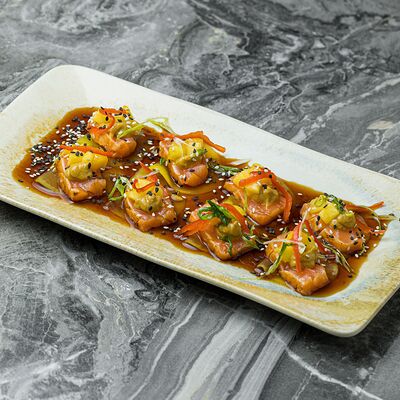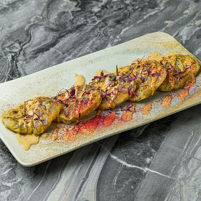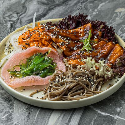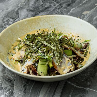 Рис, нори, сливочный сыр, огурец, соус гуакамоле, соус спайси, соус терияки, жареный лук, креветка