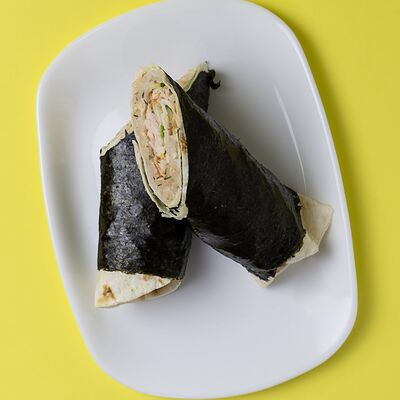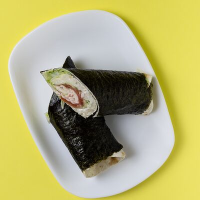 Нори, лаваш, рис, майонез, васаби, огурцы, крабовые палочки, лист салата, помидоры