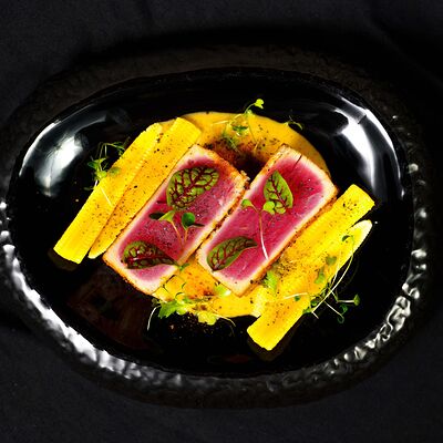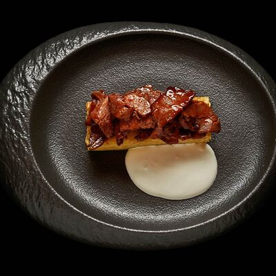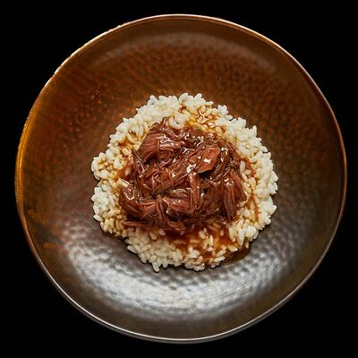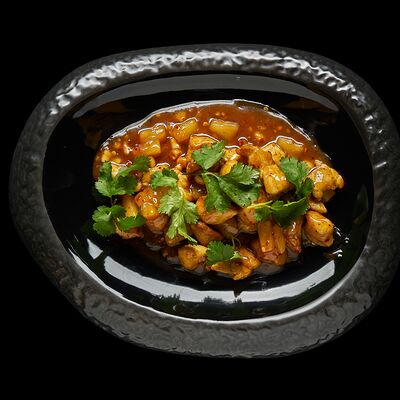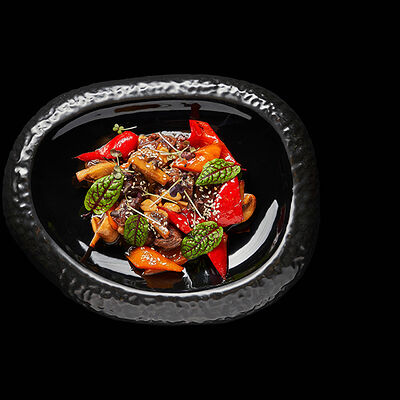 Говяжья вырезка, шампиньоны, болгарский перец, соус терияки, арахис, кунжут