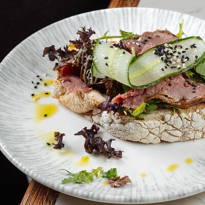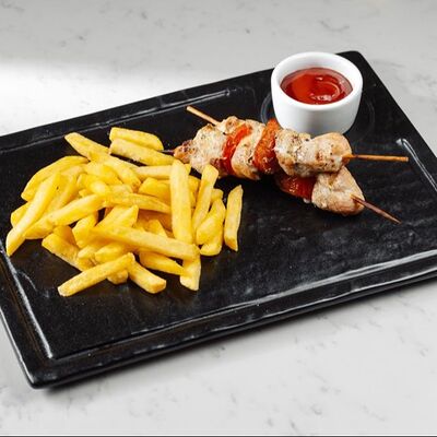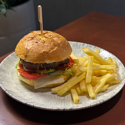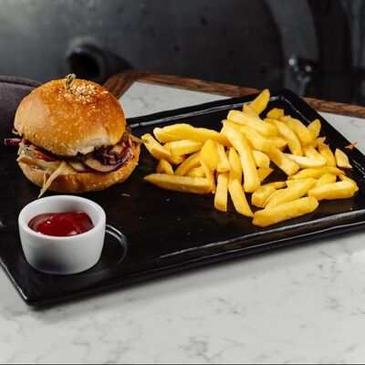 Картофель фри, котлета из говядины, томат, огурцы, айсберг, сыр чеддер, соус демиглас, майонез, кетчуп