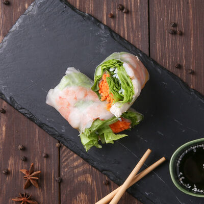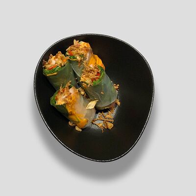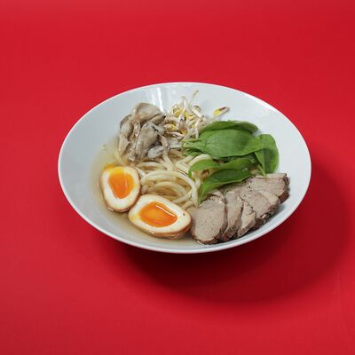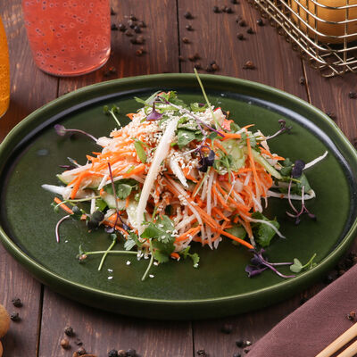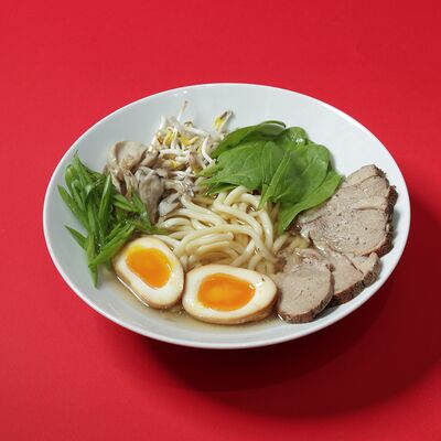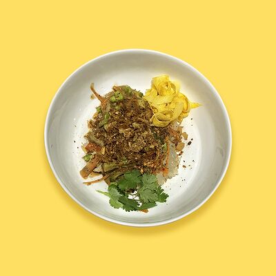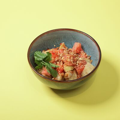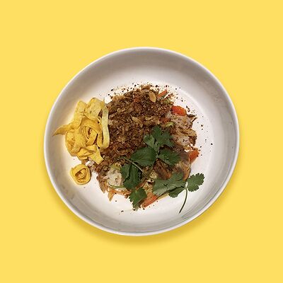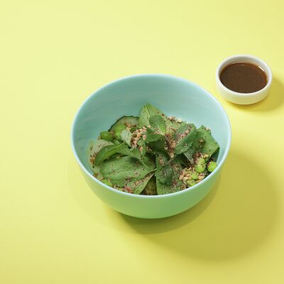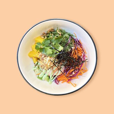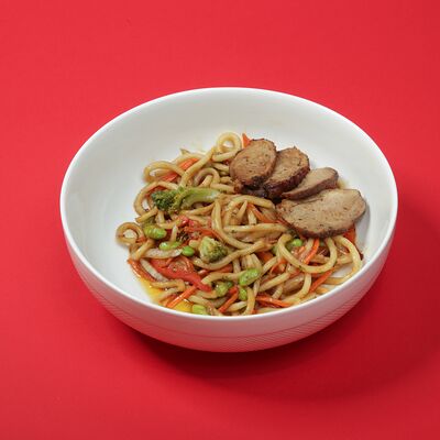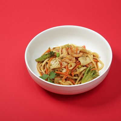 Лапша, брокколи, бобы эдамаме, пекинская капуста, морковь, болгарский перец, креветки, кальмары. В составе основного соуса - унаги, соевый, чеснок и соус на выбор. Посыпается арахисом, луком фри и кинзой