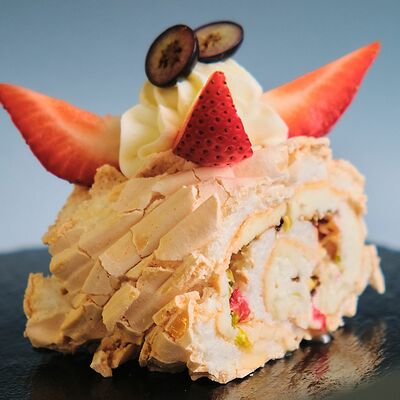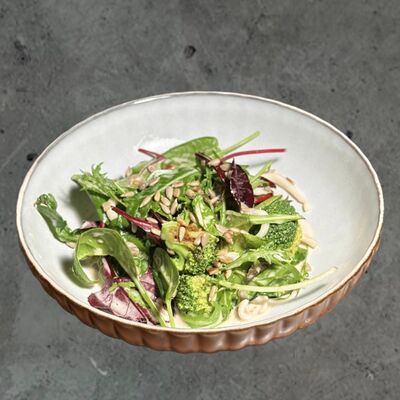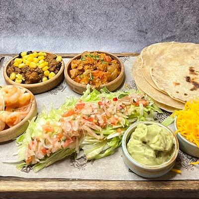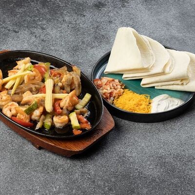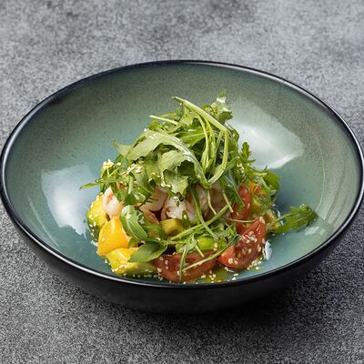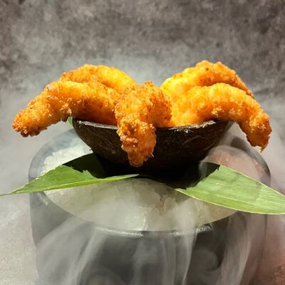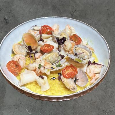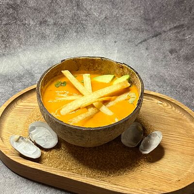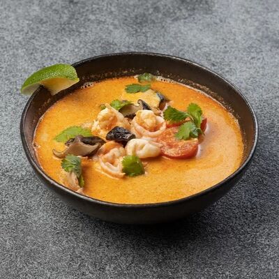 Острый суп на креветочном бульоне с кокосовым молоком, креветками, кальмарами, мидиями, томатами черри, шиитаке, рисом, кинзой
