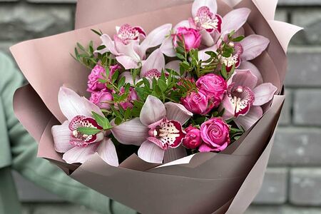 Роза кустовая - 3 шт, Орхидея (срез) - 7 шт, Рускус - 5 шт