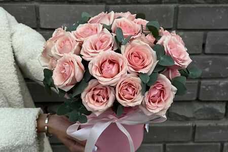 Бокс с кустовыми розами и зеленью доставка