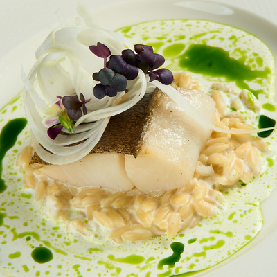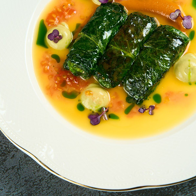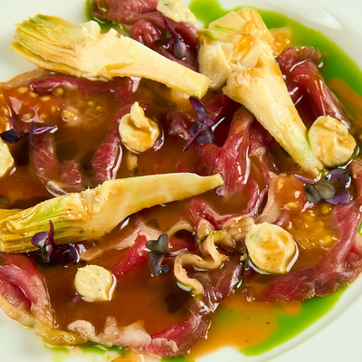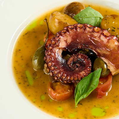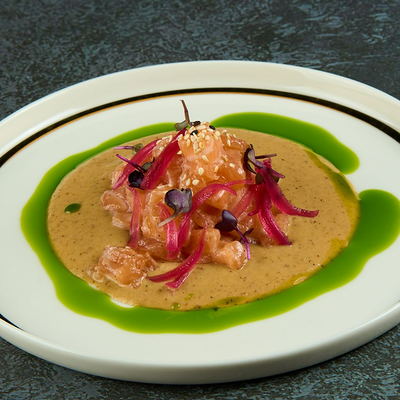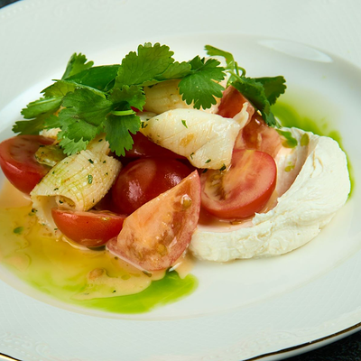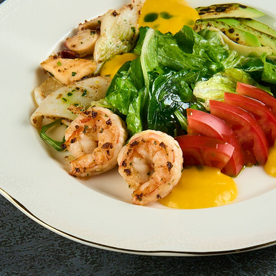 Кальмар, осьминог, креветки, шпинат, руккола, салат романо, авокадо, томаты розовые, оливковое масло, сок лайма, мусс из манго, миндаль