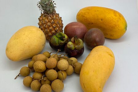 Папайя Тайланд (1 шт.), манго кат чу (1 шт.), манго махачонок (1 шт.), мангостин (2 шт.), ананас мини Тайланд (1 шт.), маракуйя (2 шт.), лонган (250 г)
