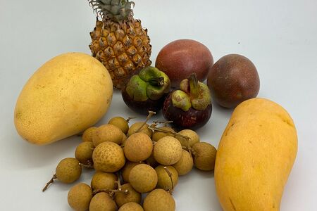 Манго махачонок (1 шт.), манго кат чу (1 шт.), мангостин (2 шт.), ананас-мини (Тайланд; 1 шт.), маракуйя (2 шт.), лонган (250 г)