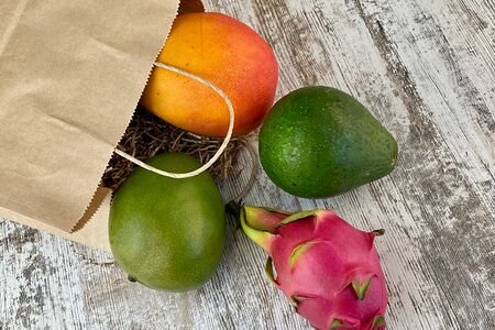 Набор из 4 экзотических фруктов: манго Кент Израиль (400 г), манго Перу (650 г), питахайя белая (410 г), авокадо Карла (550 г)