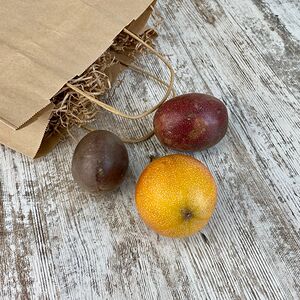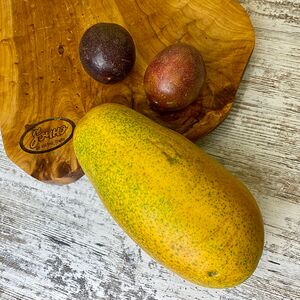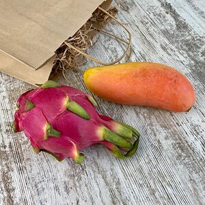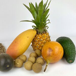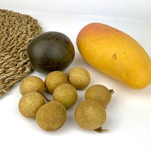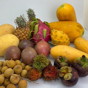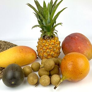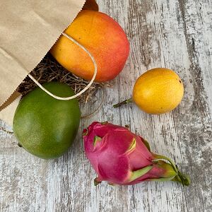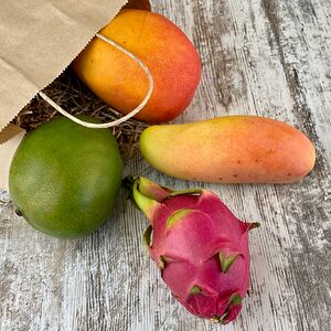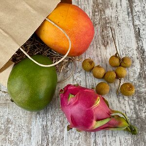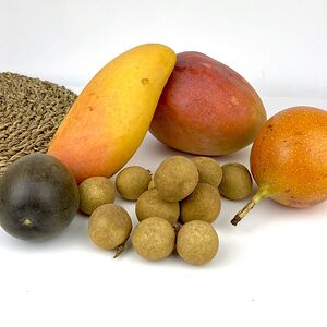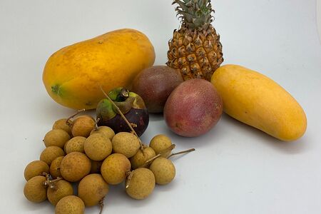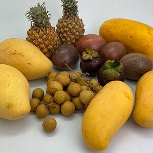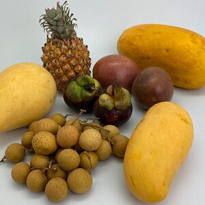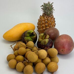 Папайя (Тайланд; 1 шт.), манго махачонок (1 шт.), мангостин (1 шт.), ананас-мини (Тайланд; 1 шт.), маракуйя (2 шт.), лонган (250 г)