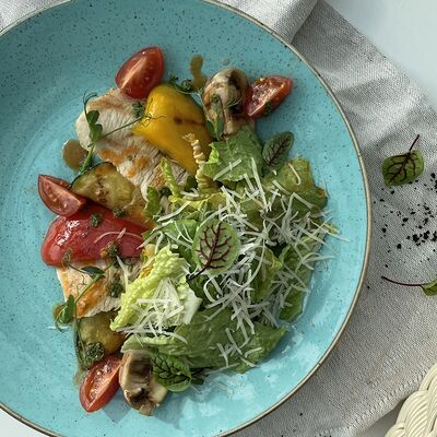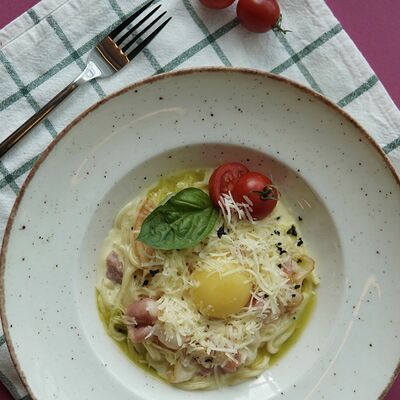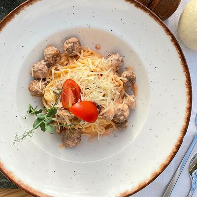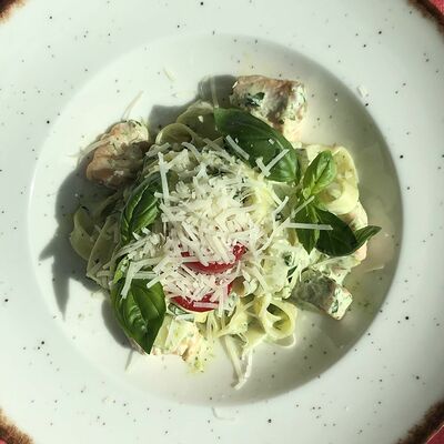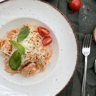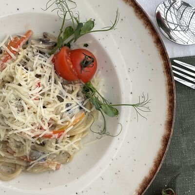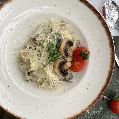 Паста феттуччине, копченая курица, шампиньоны, сыр креметте, сыр пармезан, черри