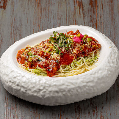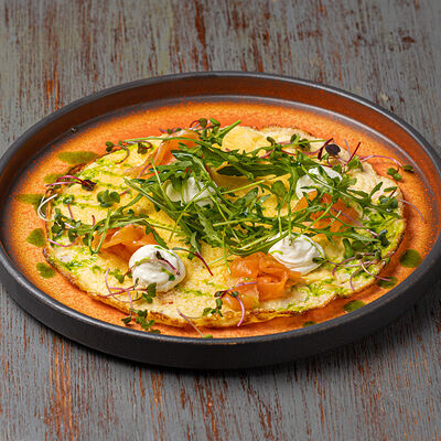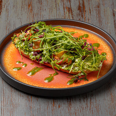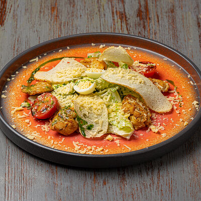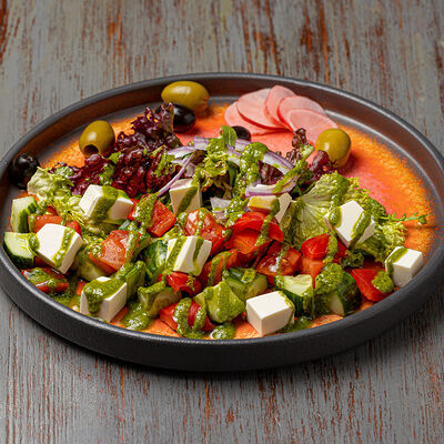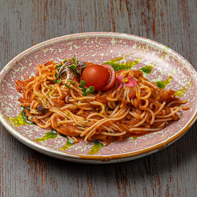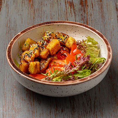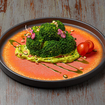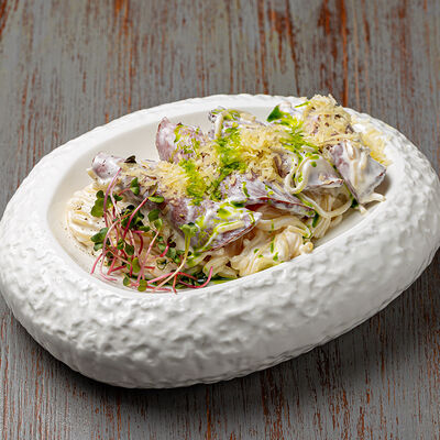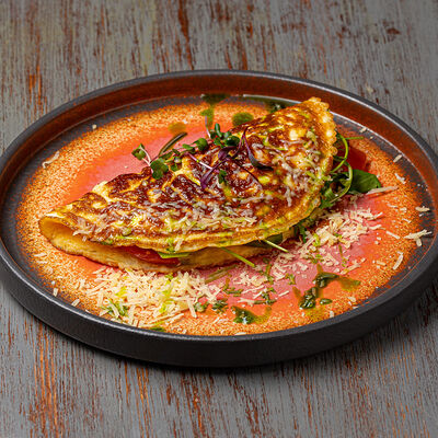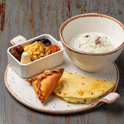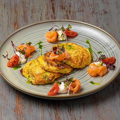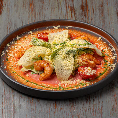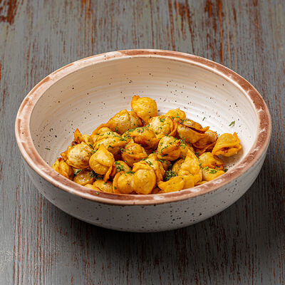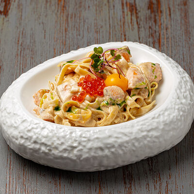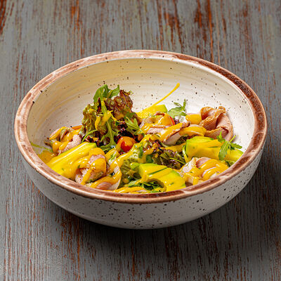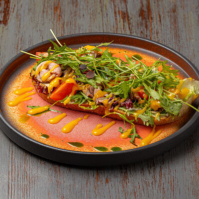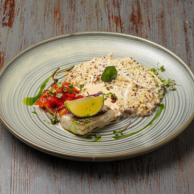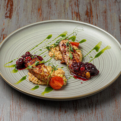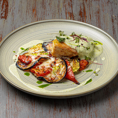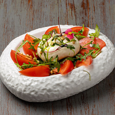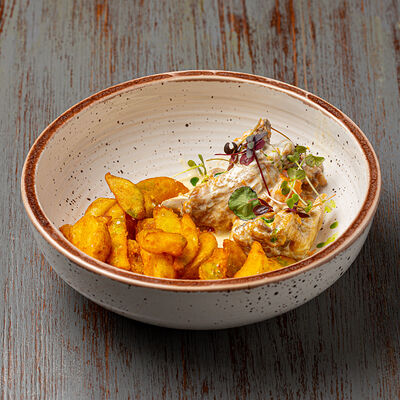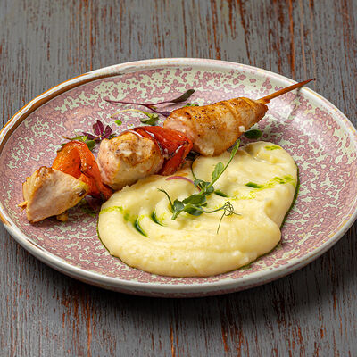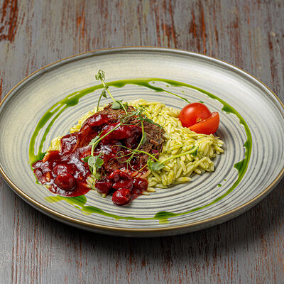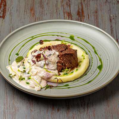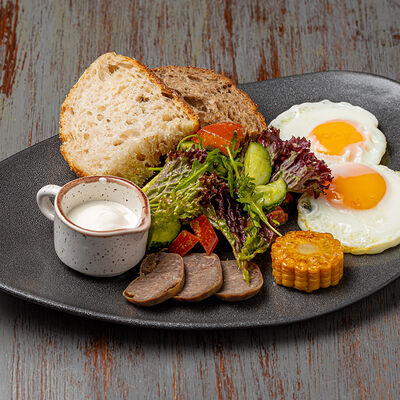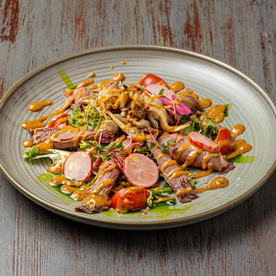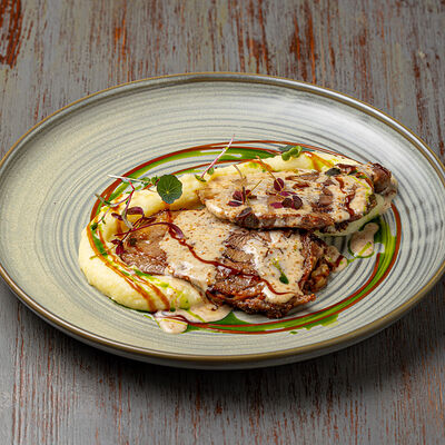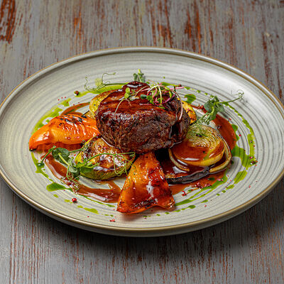 Стейк из филейного края мраморной говядины, картофель, кукуруза, помидоры черри, сливочный соус