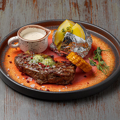 Стриплойн стейк с запеченным картофелем и кукурузой доставка