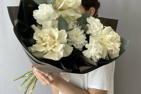 Состав: Розы ажурные - 3; Гвоздика белая - 3; Рускус - 2; Хризантема кустовая - 1; Пленка матовая - 3. Ширина: 40см. Высота: 50см.