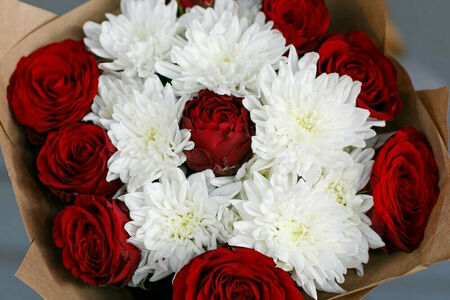 Красные розы с белыми кустовыми хризантемами в крафте доставка