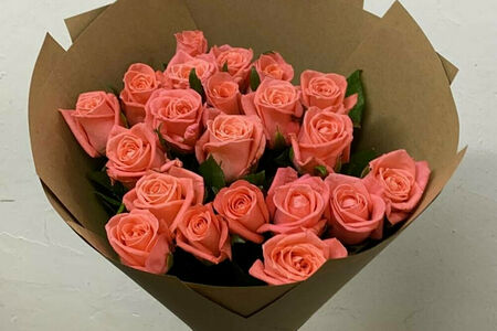 Состав: Роза - 21; Крафт - 1; Лента атласная - 1. Ширина: 30см. Высота: 60см.