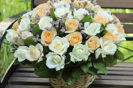 51 микс в корзине с зеленью из белой и кремовой розы доставка