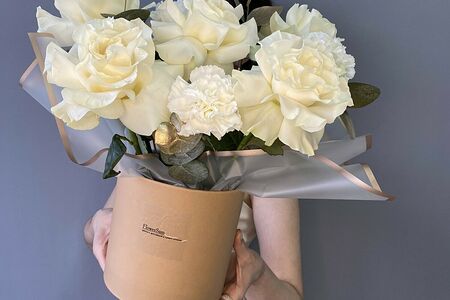 Состав: Роза - 4; Гвоздика белая - 3; Рускус краш. золотой - 2; Шляпная коробка - 1; Оазис - 1; Пленка матовая - 1. Ширина: 30см. Высота: 30см.