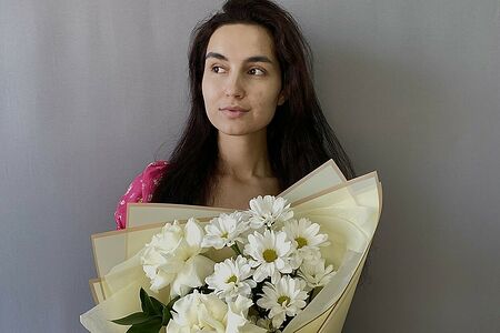 Состав: Роза белая - 3; Хризантема кустовая - 1; Рускус - 1; Пленка матовая - 2; Тишью - 1. Ширина: 25см. Высота: 50см.