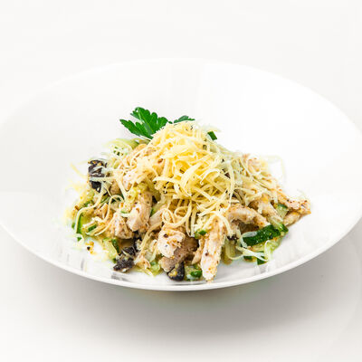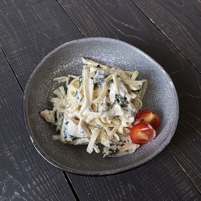 Лингвини отварные, форель, морковь, сливки, сыр пармезан, соль, перец
