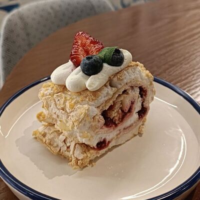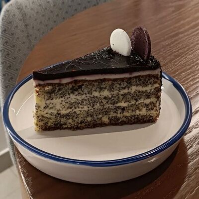 Нежнейшая основа из бисквитных маковых коржей, пропитанным заварным баварским кремом, украшенная черничным желе